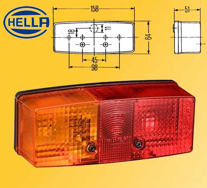 Фонарь Hella (блок 3 функц.) прямоугольный (64х158х51) задний левый