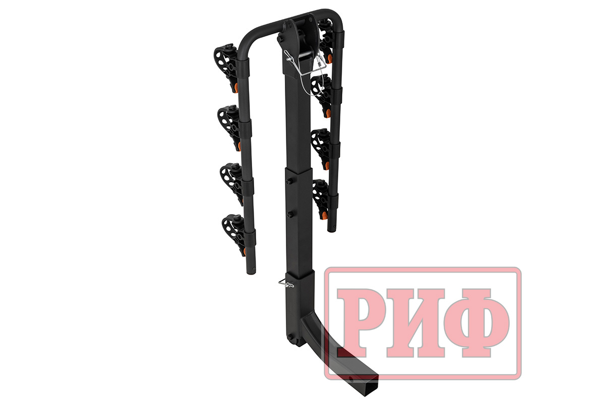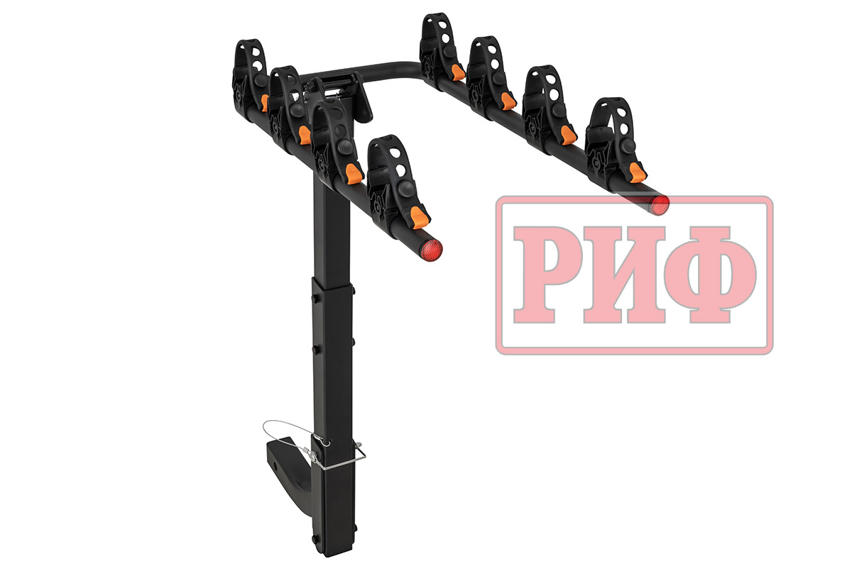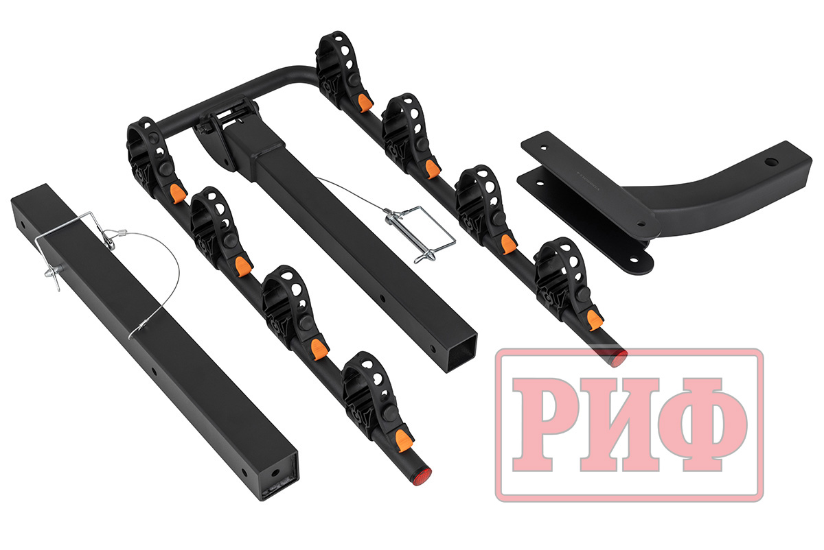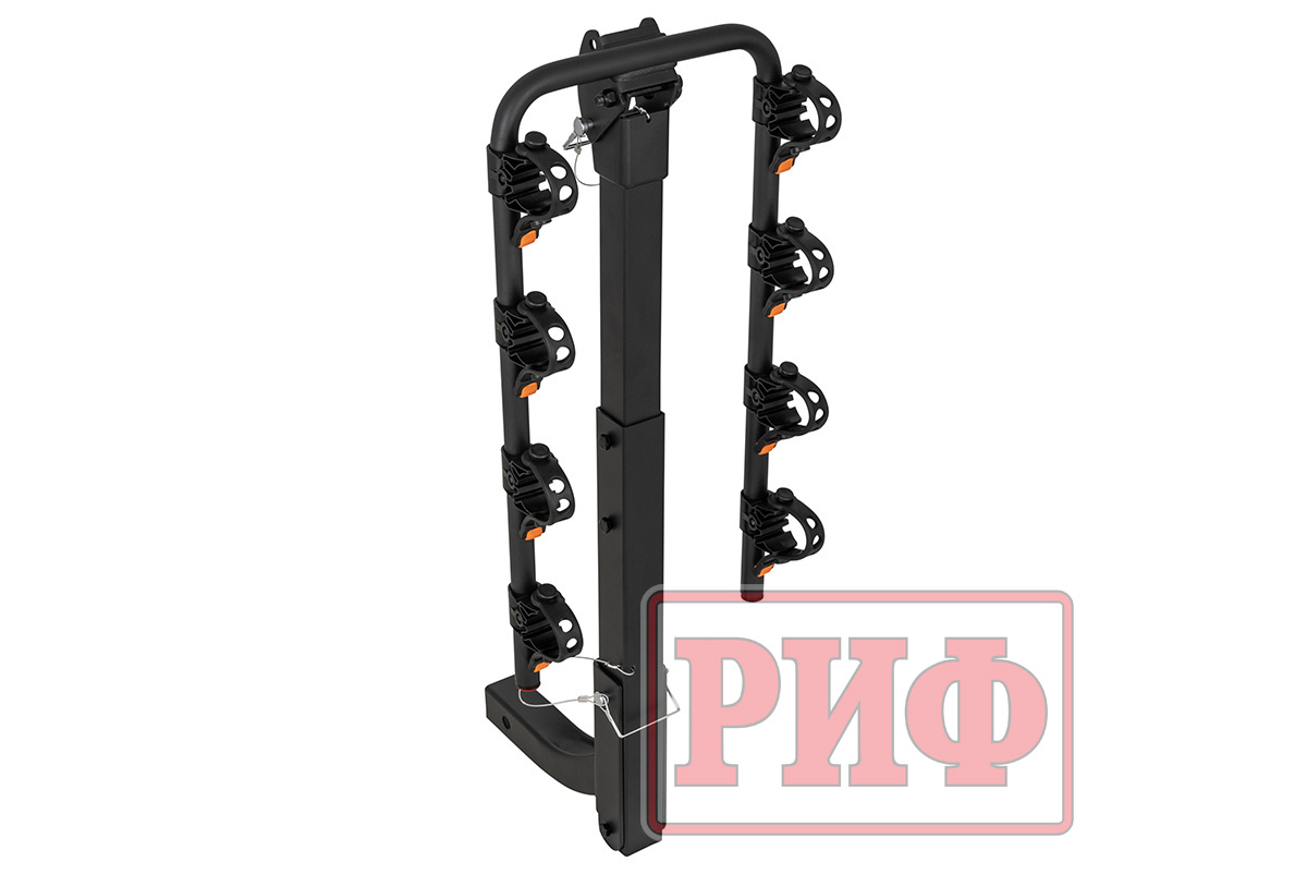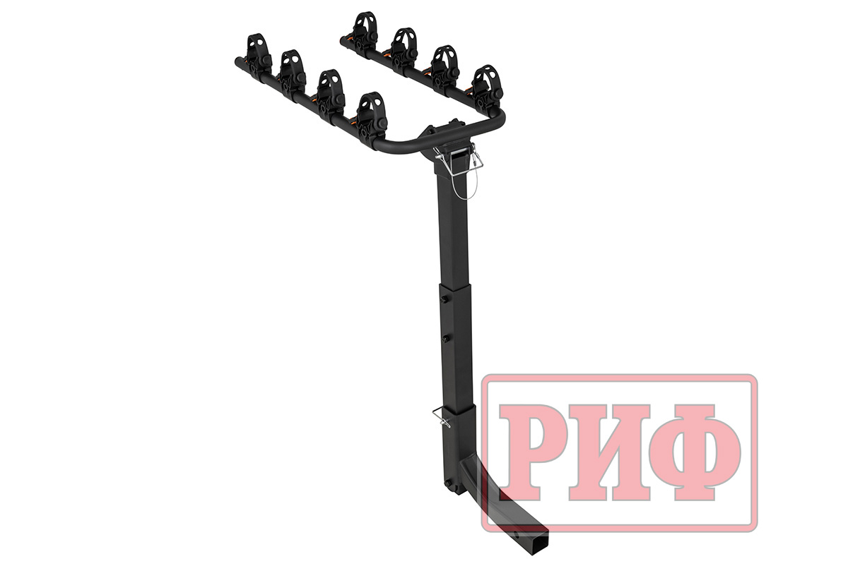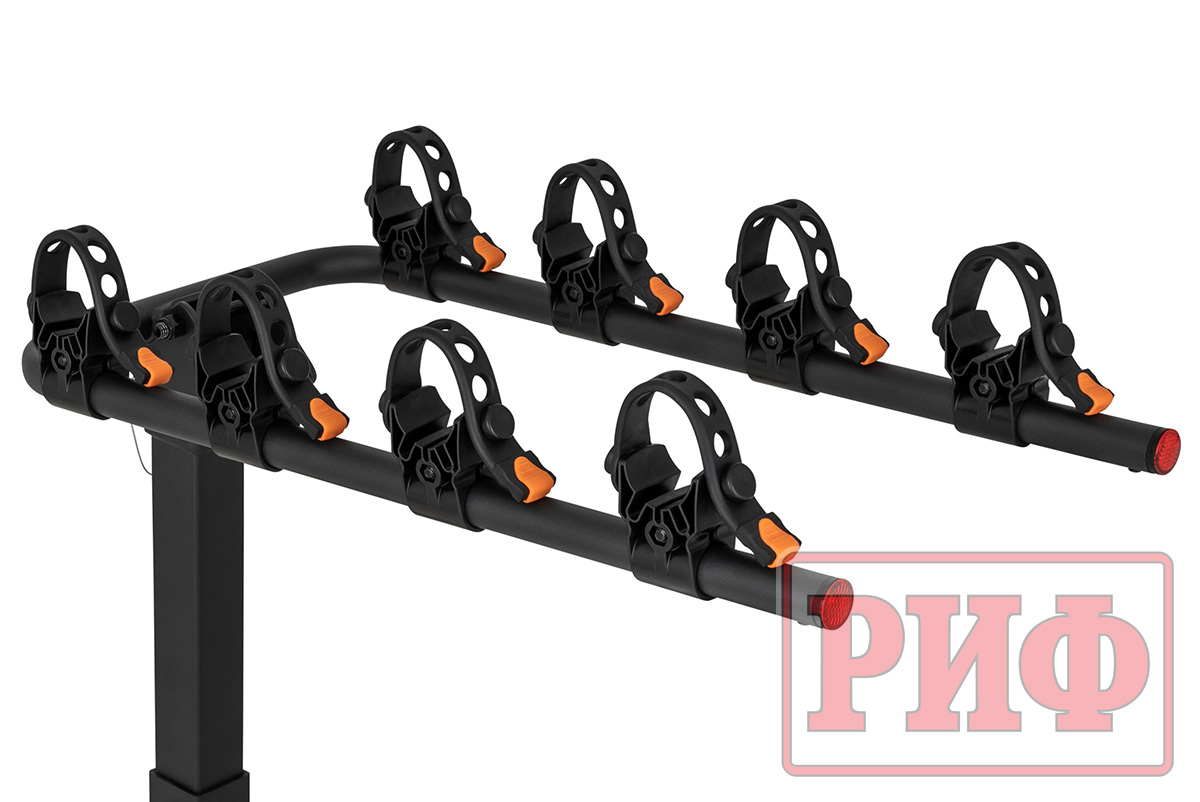 Велобагажник (вставка) РИФ в квадрат для фаркопа на 4 велосипеда Простое, надежное и быстрое в установке велокрепление рассчитанное на перевозку 4-х велосипедов. Устанавливается в силовой бампер или фаркоп с американским 50мм «квадратом». Велосипеды надёжно фиксируются за раму резиновыми креплениями типа Quick Fist. Возможна установка вместе с калиткой запасного колеса с запаской размерностью до 285/70 R17.