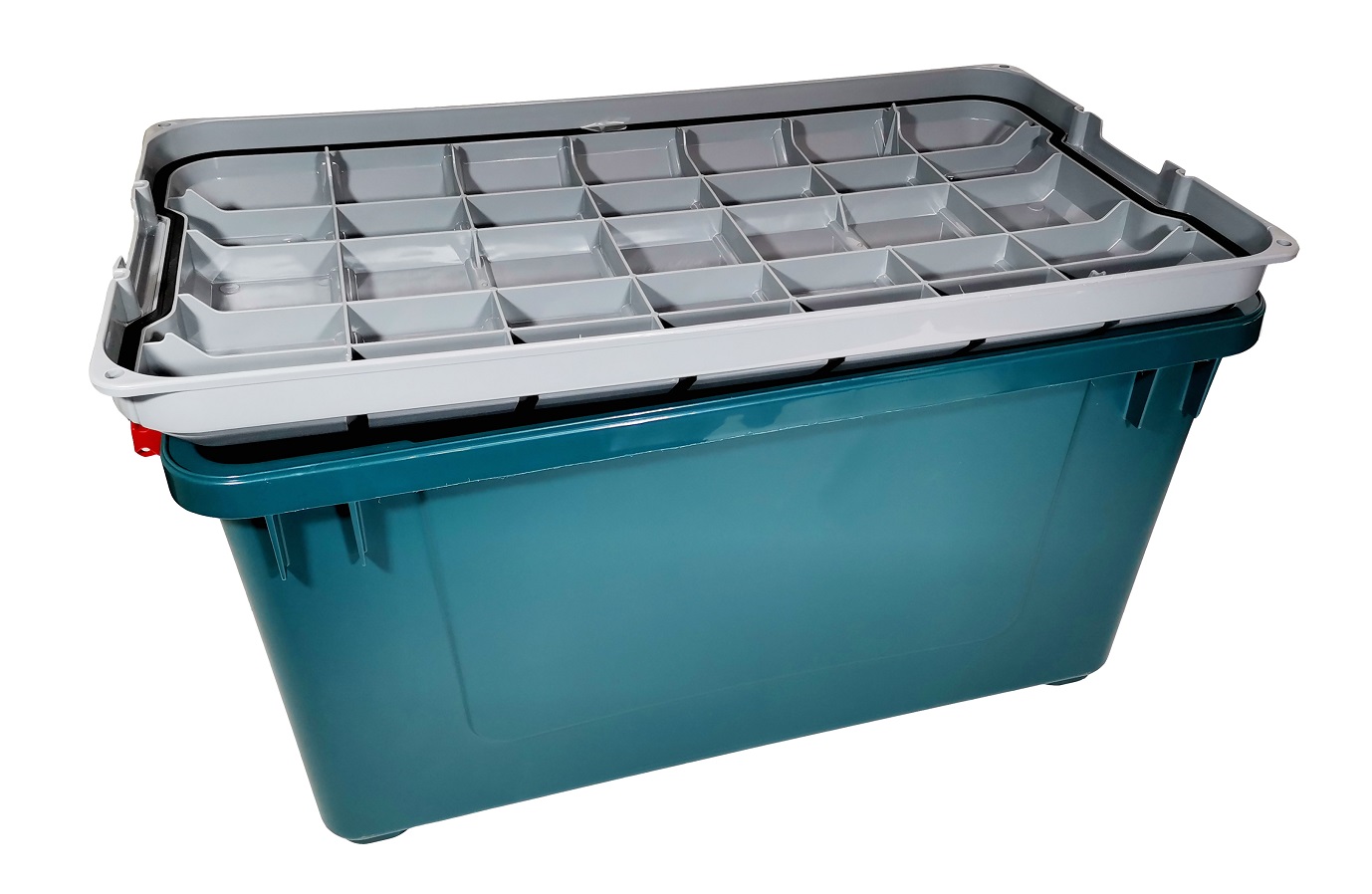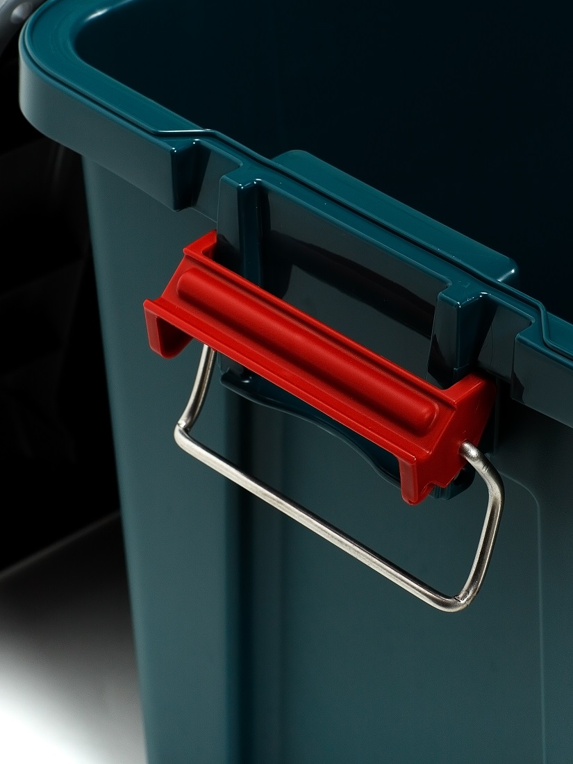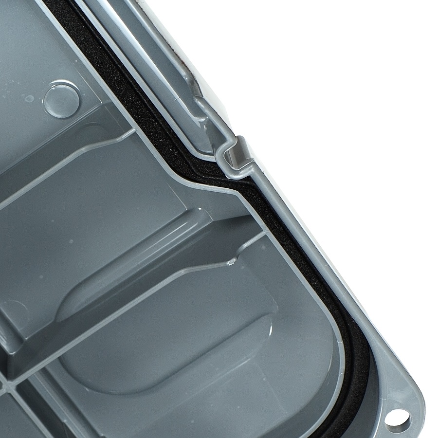 Особенности данной модели - крышка с мягкой полиуретановой прокладкой и металлические скобы на ручках - в результате ящик надежно защищен от попадания внутрь влаги и пыли.