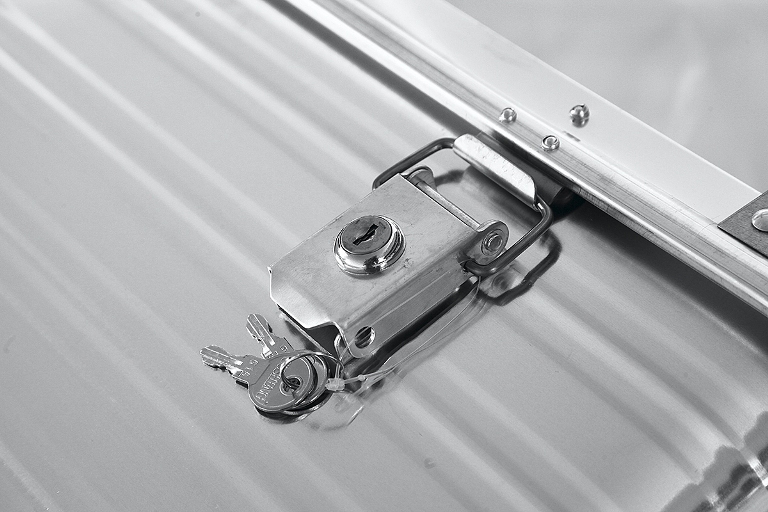 Прочность ящика обеспечивается за счёт двух мощных ребер жёсткости расположенных по периметру ящика в верхней и нижней части и штампованных ребер боковых стенок. Крышка фиксируется к ящику на крупных усиленных стальных петлях, а её открытие ограничивается капроновыми ремнями. Два замка с защелками обеспечивают надёжное закрытие и достаточную плотность прилегания крышки к уплотнительной резинке, обеспечивающей надёжную пылевлагозащиту. Замки оснащены личинками под ключ и отверстиями для опломбировки. Верхняя крышка ящика оснащена литыми уголками с упорами для усиления прочности в целом, а также для надёжной фиксации ящиков друг на друге при вертикальном штабелировании. Прочные и удобные ручки рассчитаны на перенос значительного веса.