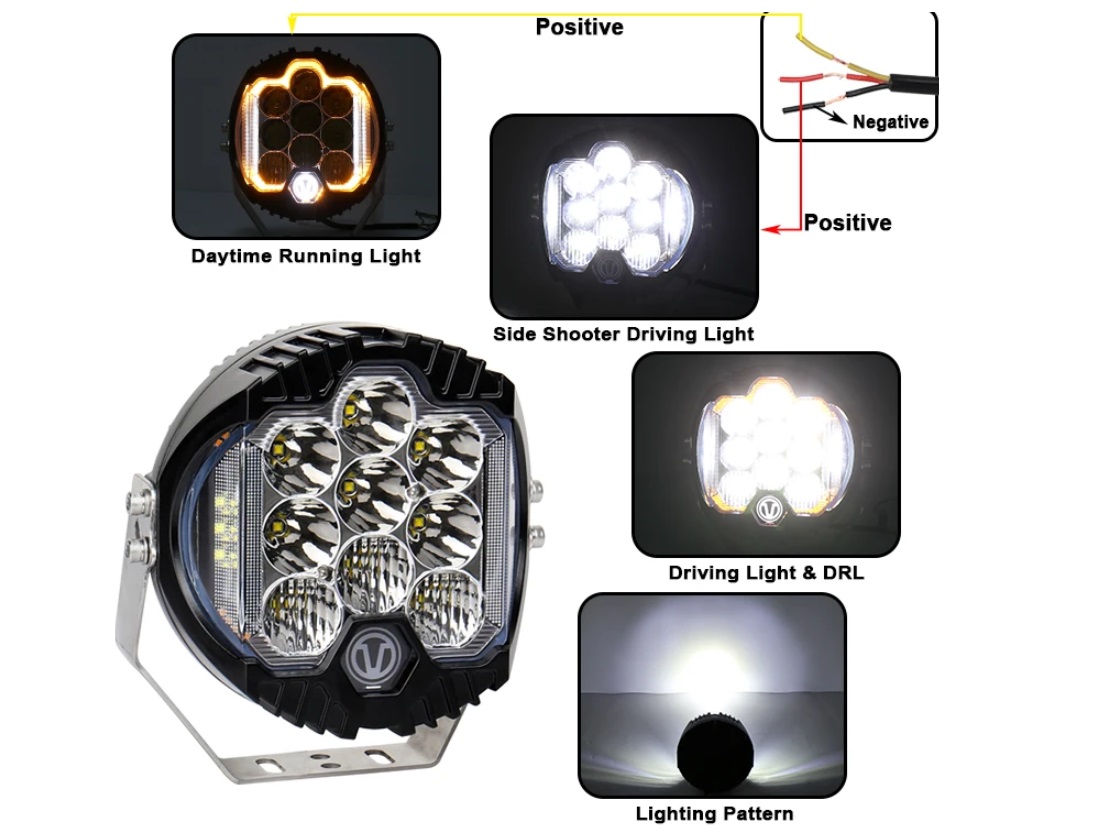 Многофункциональная конструкция: имеет 6 диодов на рефлекторе, ориентрированных на дальний свет, а также 3 диода на рефлекторах с насечками, работающие на дальний свет с небольшой растяжкой по горизонту.