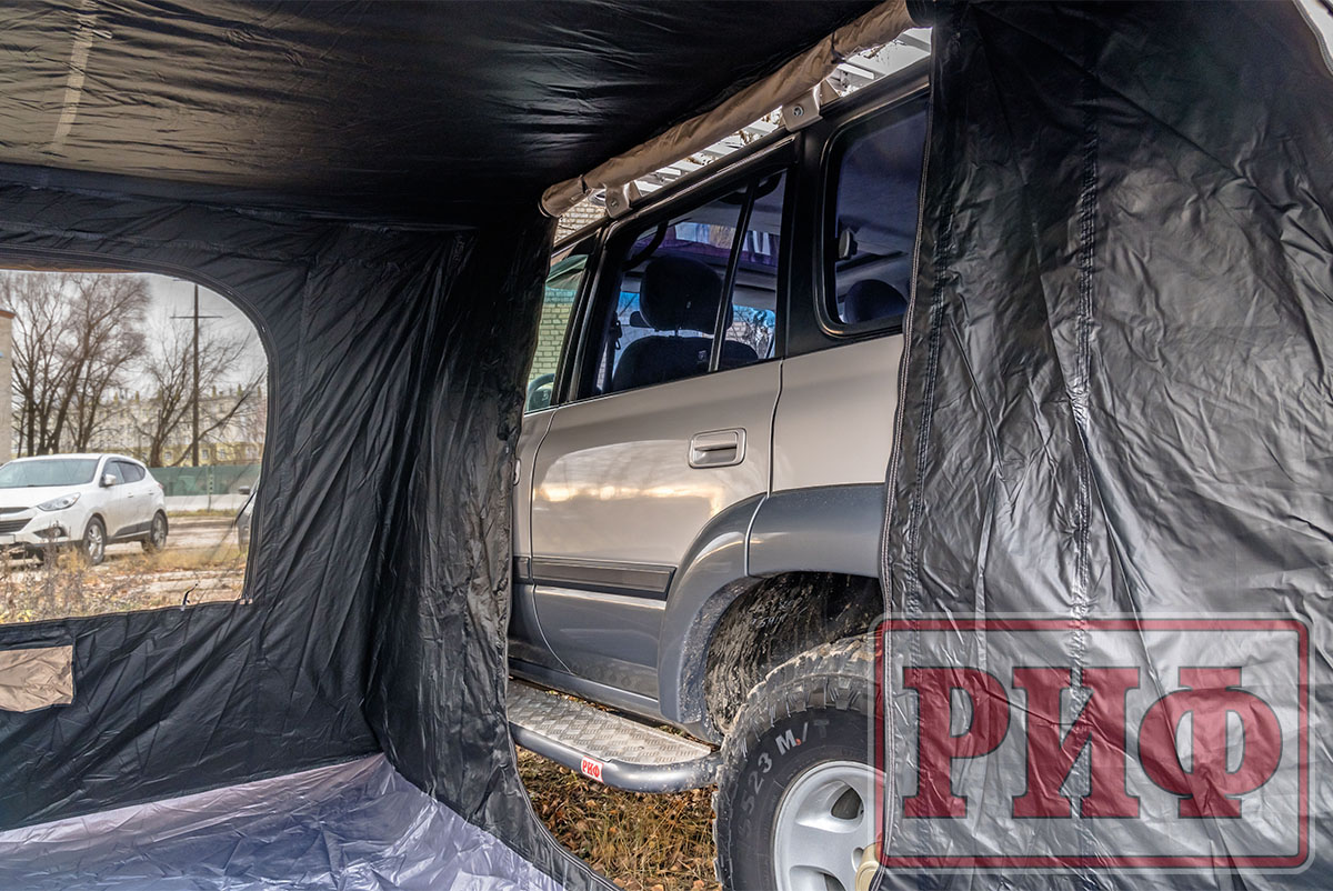 Стенки дают дополнительную защиту от ветра и дождя и позволяют организовать полноценный «тамбур» рядом с машиной.