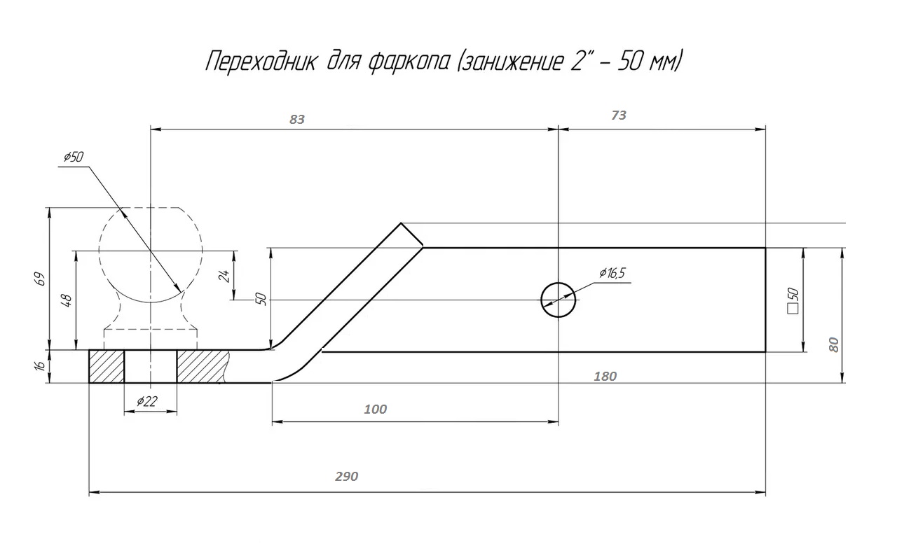 Съемный фаркоп (или переходник фаркопа) необходим при использовании более низкого прицепа с лифтованным внедорожником, поскольку позволяет добиться горизонтального расположения дышла прицепа. Фаркоп изготовлен из квадратной стальной трубы под стандартное двухдюймовое (5 см) крепление типа «американский квадрат» и имеет отверстие под крепежный «палец». Шар тип E 50мм.