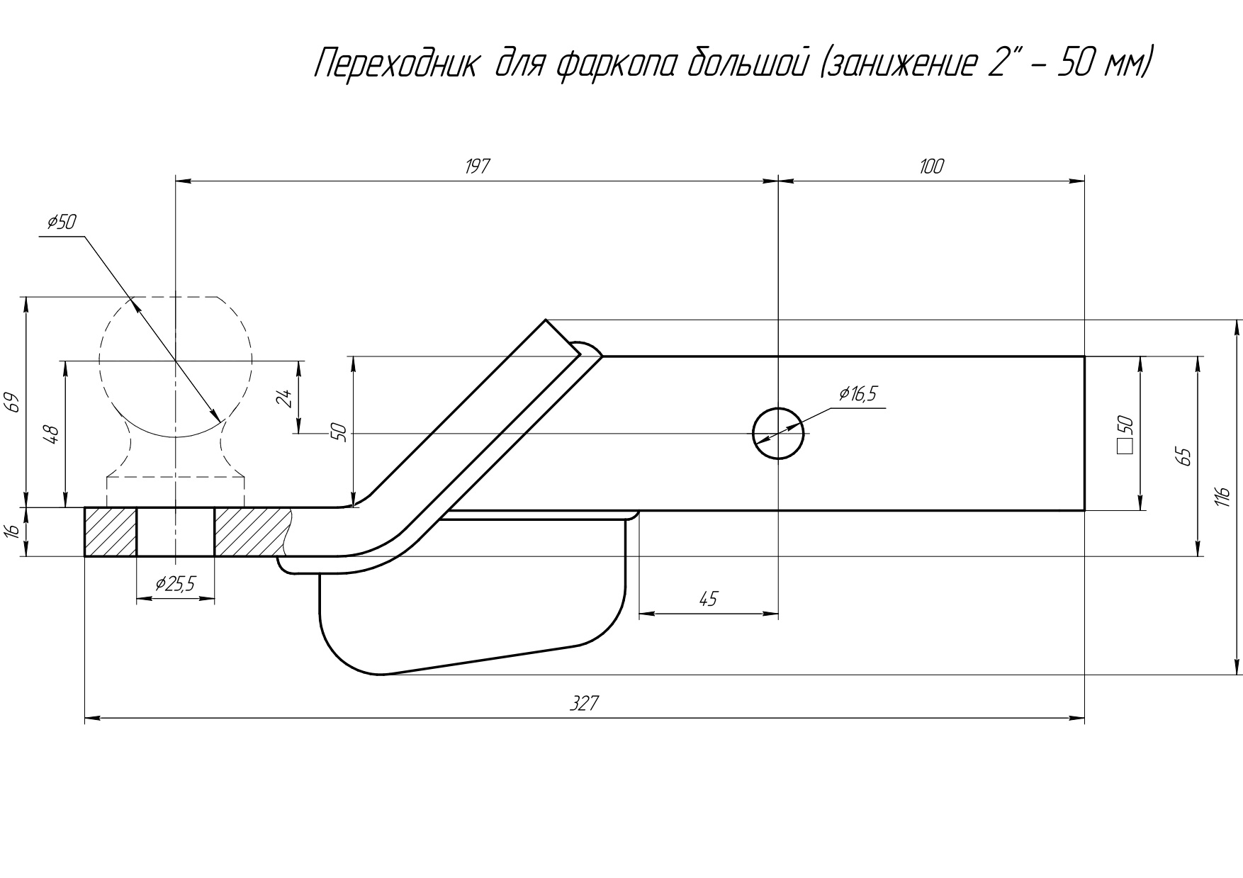 Вставка в «квадрат» – Фаркоп с пониженной площадкой под шар Особенность данной вставки – пониженная площадка под шар фаркопа. Известно, что дышло прицепа в идеале должно располагаться горизонтально, чего сложно добиться владельцам лифтованных автомобилей при использовании стандартных вставок-фаркопов. Фаркоп с пониженной площадкой под шар позволяет добиться горизонтальности дышла, а значит, минимизирует вероятность повреждения замка фаркопа и позволяет добиться правильного распределения нагрузок внутри прицепа. Вставки сделаны из трубы под стандартный (2”) квадрат с толщиной стенок 5 мм и имеют отверстие под крепежный «палец». Площадка под шар имеет толщину 19 мм. На всех вставках, кроме двухдюймовой, имеются усилители, предотвращающие деформацию площадок. Вставки поставляются окрашенными в черный цвет порошковой краской, стойкой к коррозии даже в городских условиях.