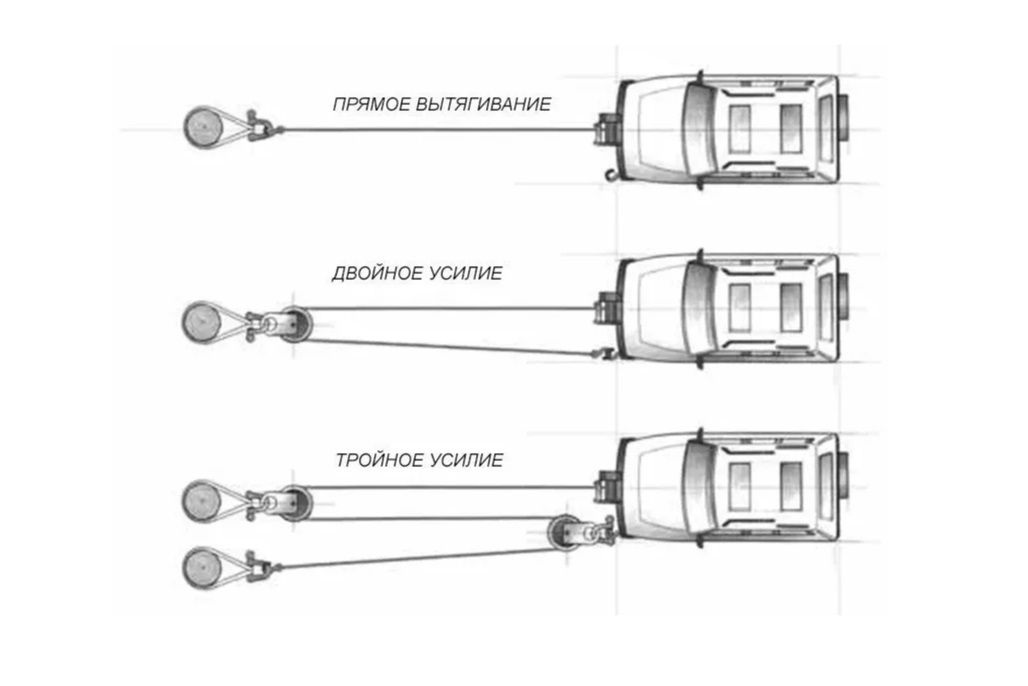 Блок усиления или полиспаст используется для увеличения тягового усилия лебедки. Применение блока позволяет увеличить усилие, создаваемое лебедкой вдвое. Блок нужен в случае, когда мощность лебедки недостаточна для вызволения автомобиля из "засады"и лебедка фактически останавливается. Чтобы предотвратить разрушение лебдки черезмерной нагрузкой используют блок. Скорость сматывания при этом уменьшается в 2 раза.