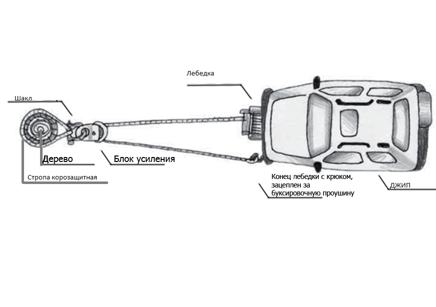 Блок усиления или полиспаст используется для увеличения тягового усилия лебедки. Применение блока позволяет увеличить усилие, создаваемое лебедкой вдвое. Блок нужен в случае, когда мощность лебедки недостаточна для вызволения автомобиля из "засады"и лебедка фактически останавливается. Чтобы предотвратить разрушение лебдки черезмерной нагрузкой используют блок. Скорость сматывания при этом уменьшается в 2 раза.
