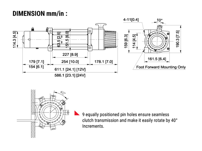Т-образная эргономичная рукоять для свободного разматывания троса(T-ручка перемещенная лишь легким поднятием-и-поворотом освобождает вращающуюся кольцевую шестерню для быстрого разматывания троса. Она может быть зафиксирована в любом из 9 положений - шаг поворота 40 градусов, что дает возможность использовать бамперы различных конструкций)