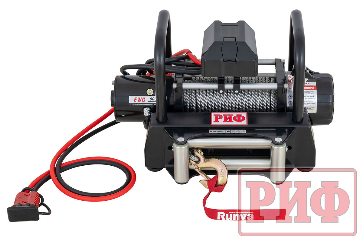 У лебедки серии EWG9000U-KIT2 достаточное тяговое усилие, чтобы справиться с внедорожником массой до трех тонн. В основе ее лежит недорогая лебедка Magnum от известного производителя лебедок Runva с двигателем мощностью 6,1 л.с. и редуктором с передаточным числом 184:1 и тягой на первом ряду 4082 кг со скоростью 1.5 метра в минуту. Вместе с площадкой производства РИФ переносная лебедка со стальным тросом весит порядка 50 килограмм. Длина троса 20 метров.