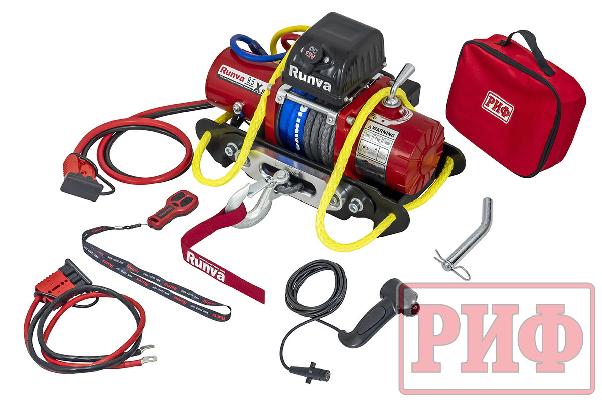 Лебёдка переносная РИФ 9.5XS c квадратом для фаркопа и проводами в сборе, короткий барабан, синтетический трос (облегченная)