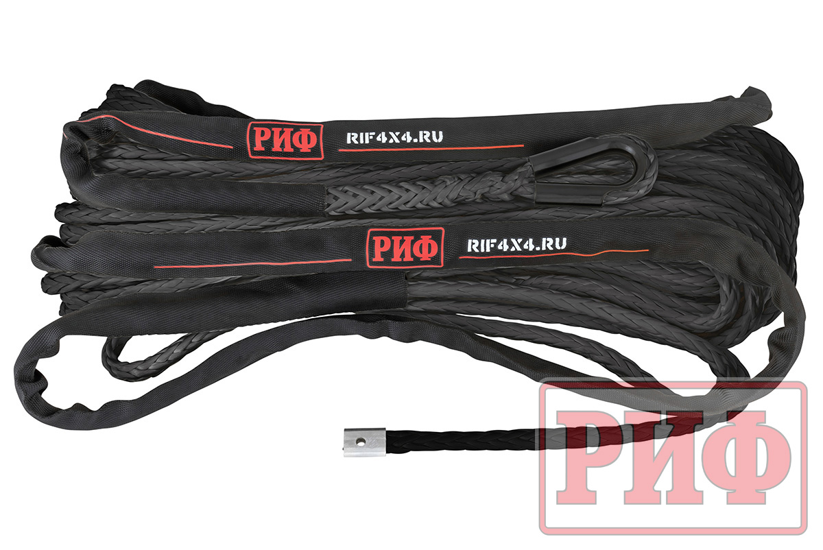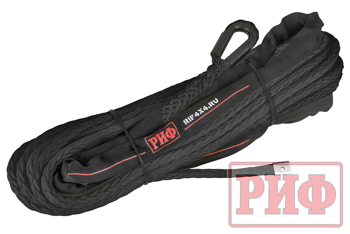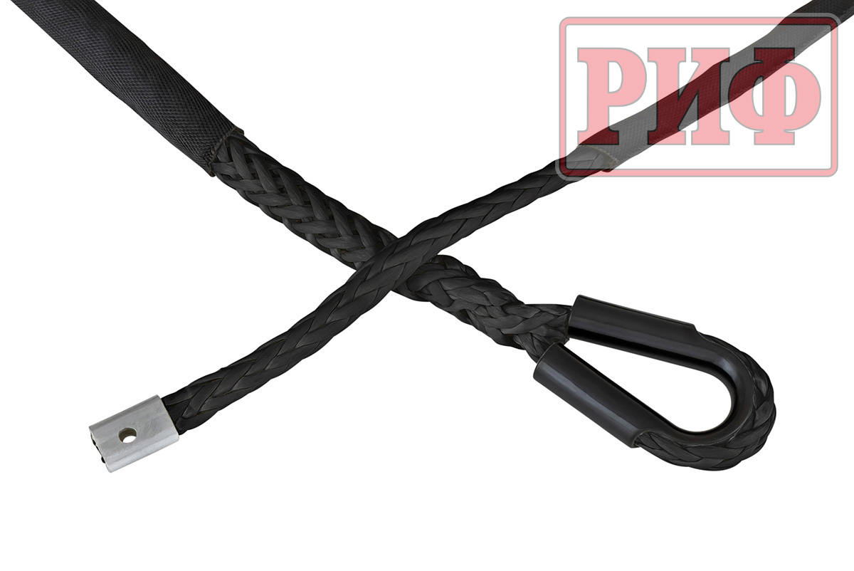 Синтетический трос РИФ изготовлен из UHMWPE(Ultrahigh molecular weight polyethylene) – полиэтилен (c ультравысокой молекулярной массой) и также прочен, как стальной, но при этом он очень легкий, износостойки и абсолютно безопасный в использовании – даже если он порвется под нагрузкой, тяжелых травм человеку и автомобилю не нанесет благодаря мягкости и маленькому весу.