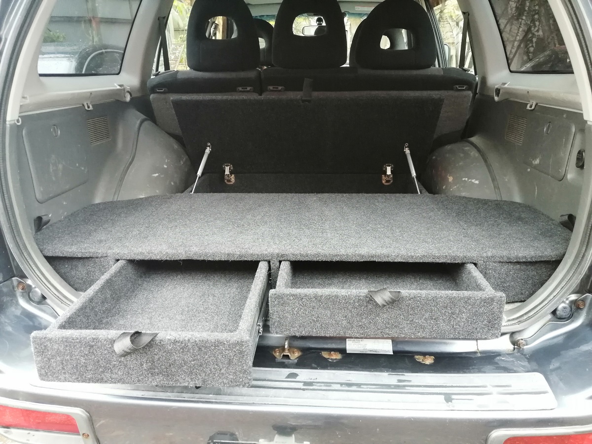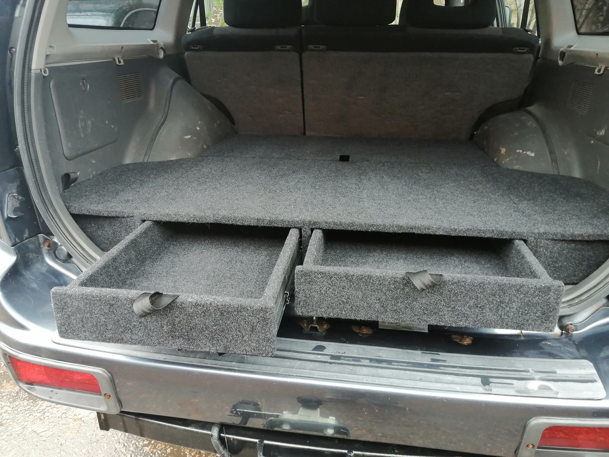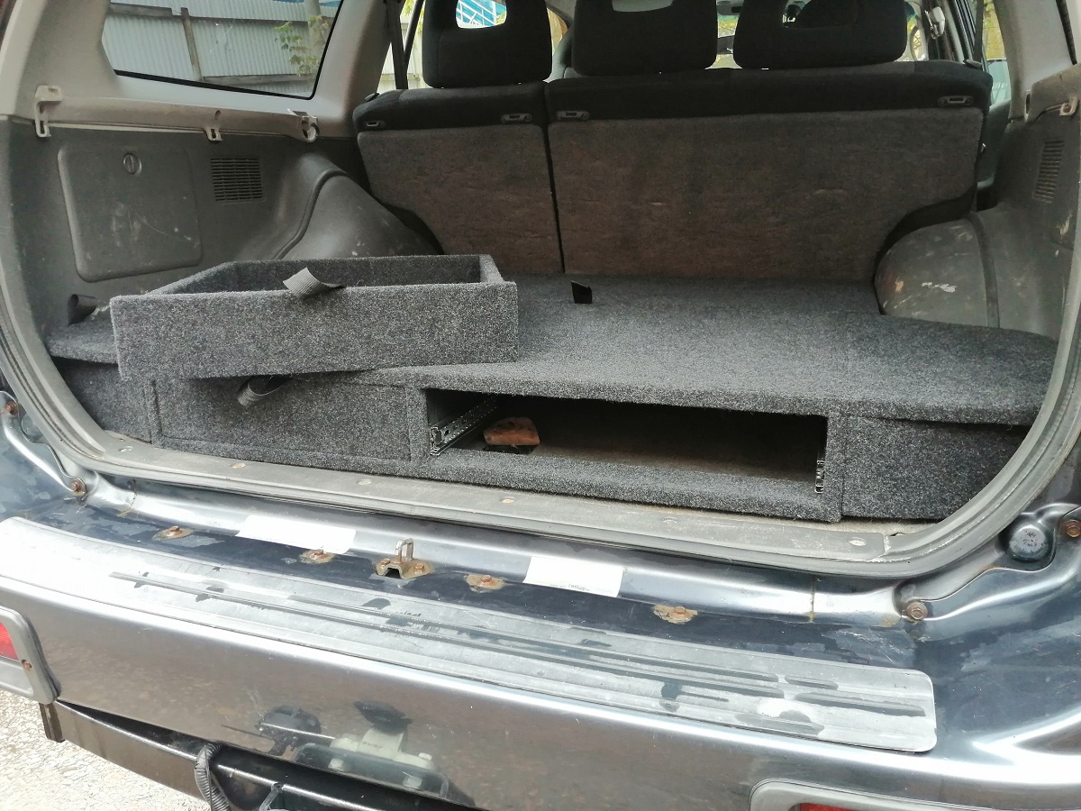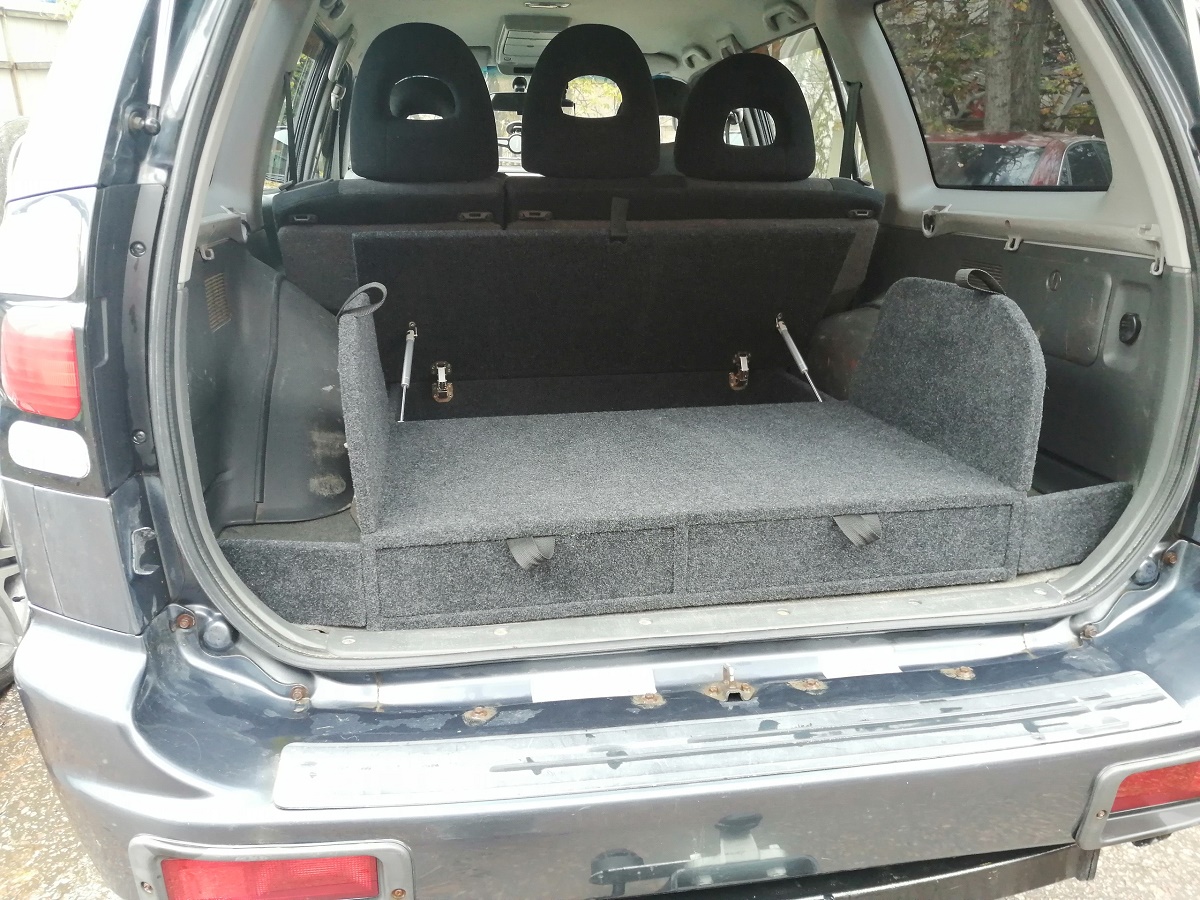 Данный органайзер-спальник позволяет убрать весь шмурдяк (стропы, огнетушитель, аптечку, небольшие домкраты и т.д.) в свои просторные ящики. А так же при сложенных спинках сидений образует ровный пол, а значит можно с комфортом обустроить спальное место на несколько человек.