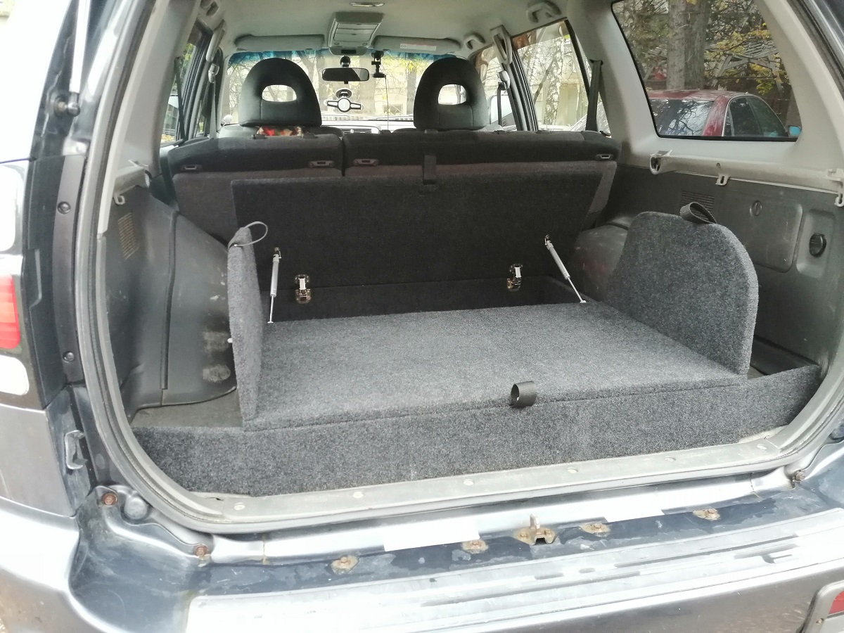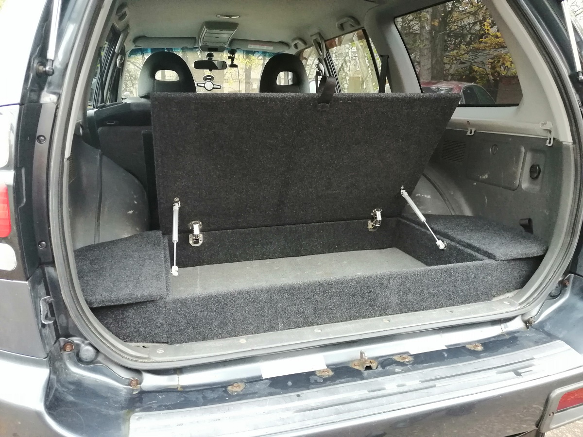 Данный органайзер-спальник позволяет убрать весь шмурдяк (стропы, огнетушитель, аптечку, небольшие домкраты и т.д.) в свои просторные ящики. А так же при сложенных спинках сидений образует ровный пол, а значит можно с комфортом обустроить спальное место на несколько человек.