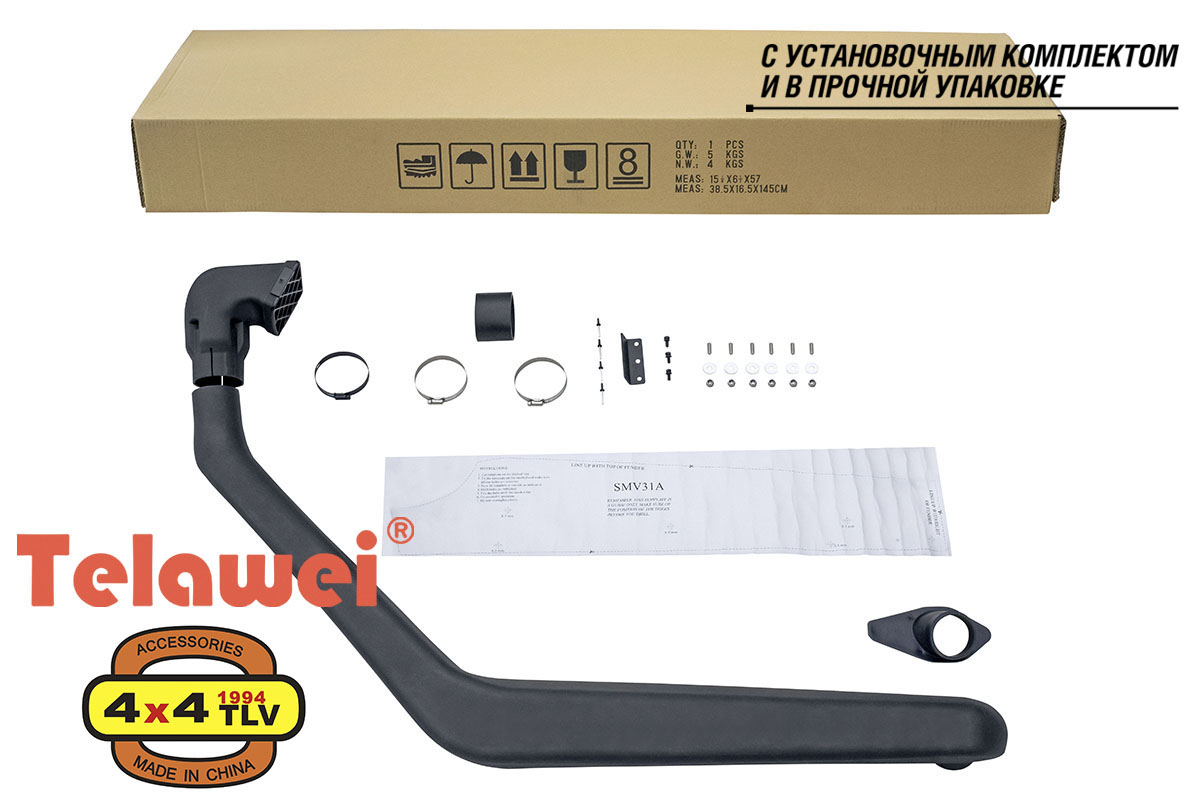 Шноркель Telawei , китайский шноркель - это труба-воздухозаборник необходимая для форсирования водных преград и предназначенная для защиты двигателя от попадания воды и предохраняющая его от гидроудара. Также китайский шноркель уменьшает загрязнение воздушного фильтра при езде по песку и пыльным дорогам. Шноркель Telawei, китайский шноркель - обязательный атрибут Вашего внедорожника. Китайский шноркель Telawei не уступает по качеству изготовления таким брендам как Safari Snorkel, TJM Snorkel которые произведены в Австралии.