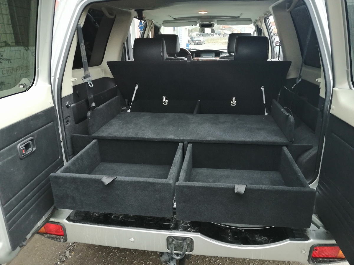 Данный органайзер-спальник позволяет убрать весь шмурдяк (стропы, огнетушитель, аптечку, небольшие домкраты и т.д.) в свои просторные ящики. А так же при сложенных спинках сидений образует ровный пол, а значит можно с комфортом обустроить спальное место на несколько человек.