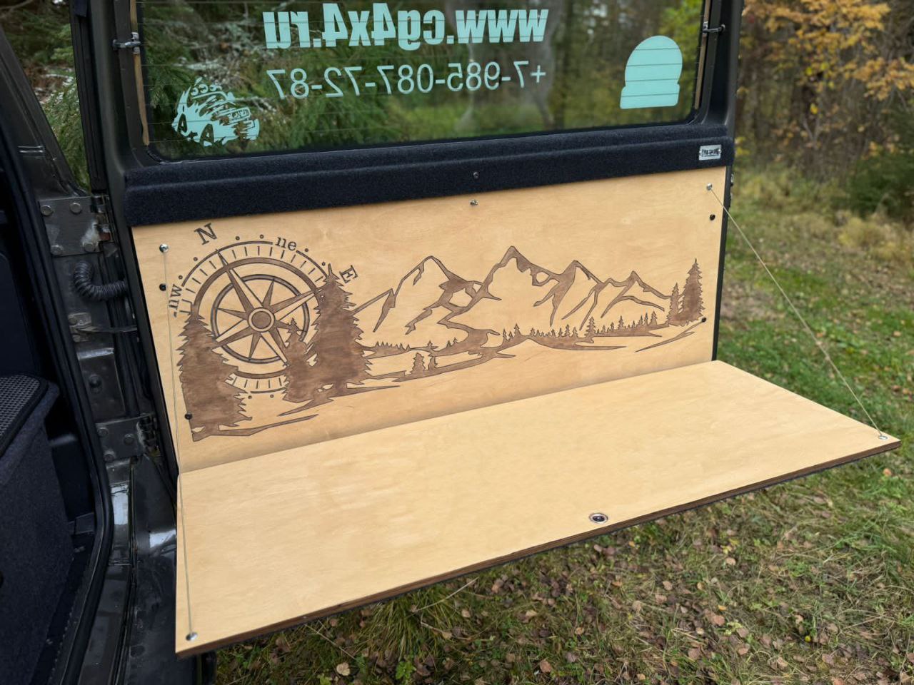 Панель с откидным столом на заднюю дверь багажника Уаз Патриот. Данная панель монтируется вместо штатной пластиковой накладки с помощью болтов и резьбовых клепок (крепеж идет в комплекте). Стол надежно зафиксирован как в транспортном положении так и в рабочем!
