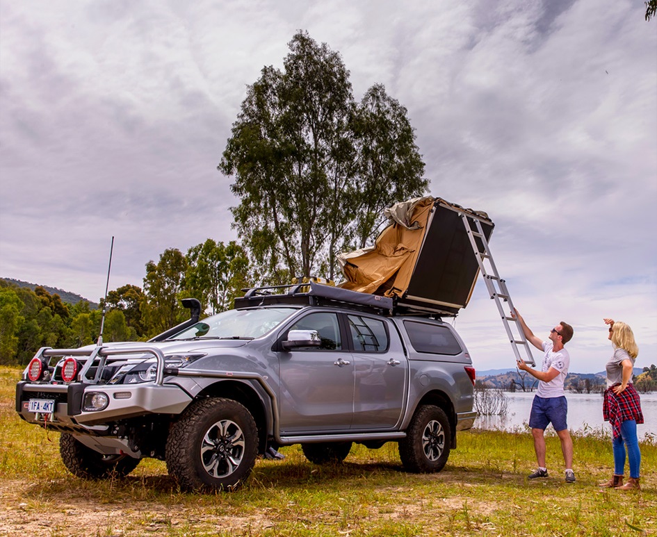 Палатка ARB Simpson Series3 поставляется с тамбуром первого этажа, матрасом и лестницей.