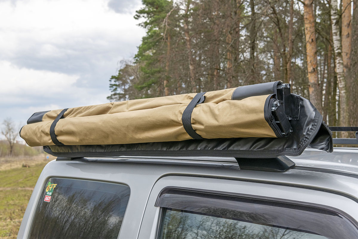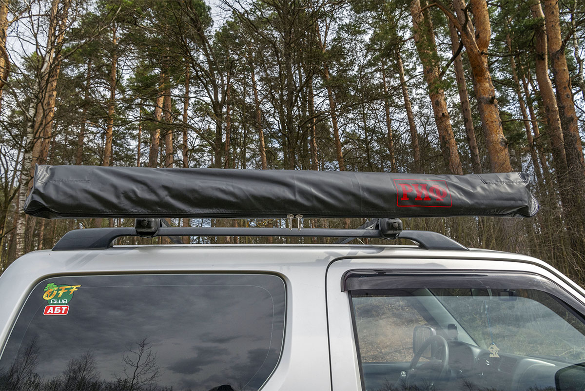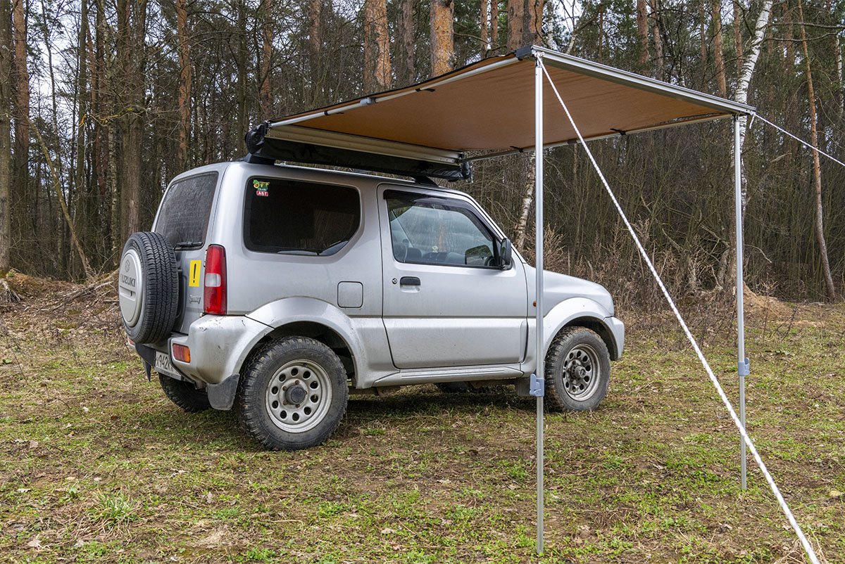 Размер тента в рабочем состоянии: 1,4 метра по автомобилю и 2 метра по вылету. Такой тент позволяет с комфортом разместить рядом с автомобилем двух человек.