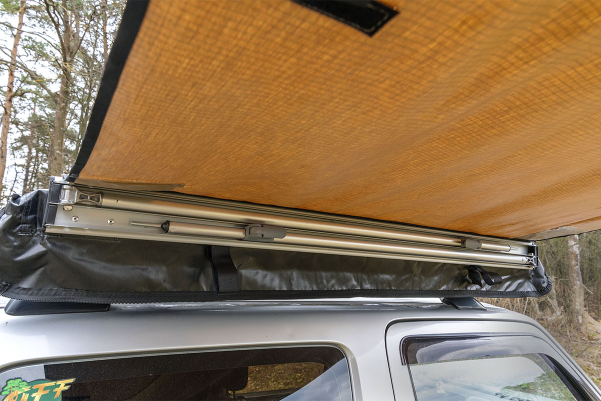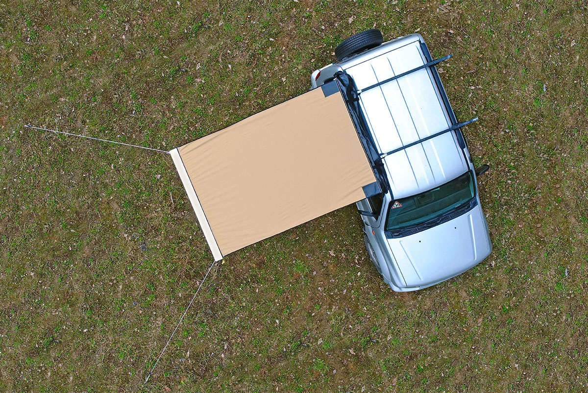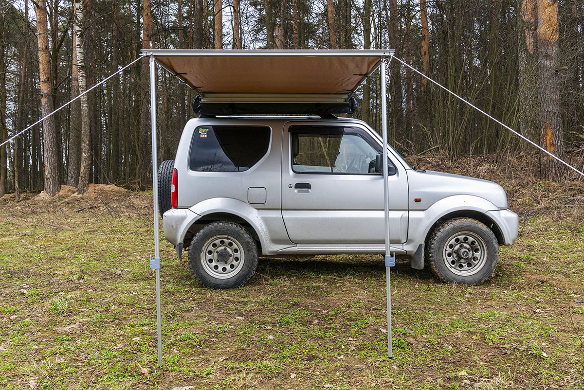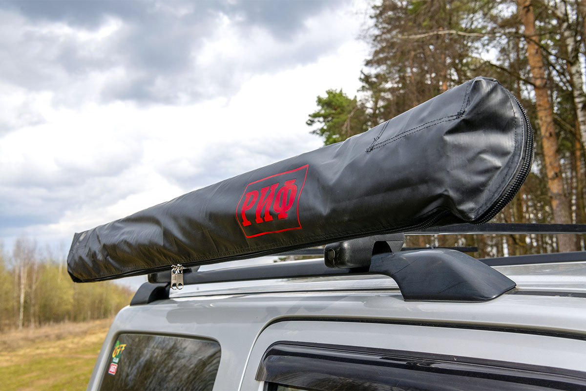 Размер тента в рабочем состоянии: 1,4 метра по автомобилю и 2 метра по вылету. Такой тент позволяет с комфортом разместить рядом с автомобилем двух человек.