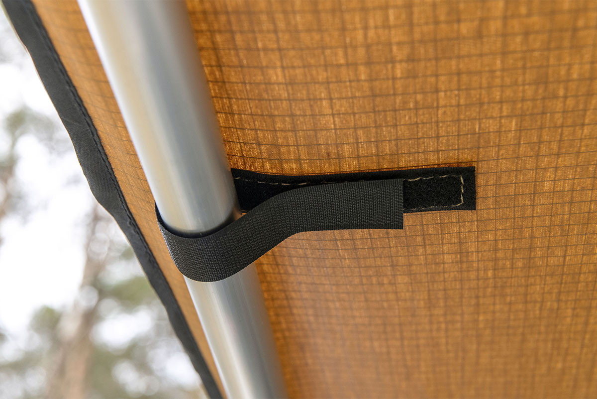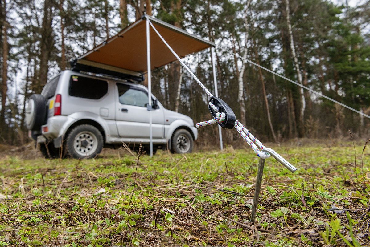 Установка тента под силу даже одному человеку и занимает не более двух-трех минут. В комплект входят веревочные растяжки с возможностью регулировки натяжения и металлические колья для крепления к грунту.