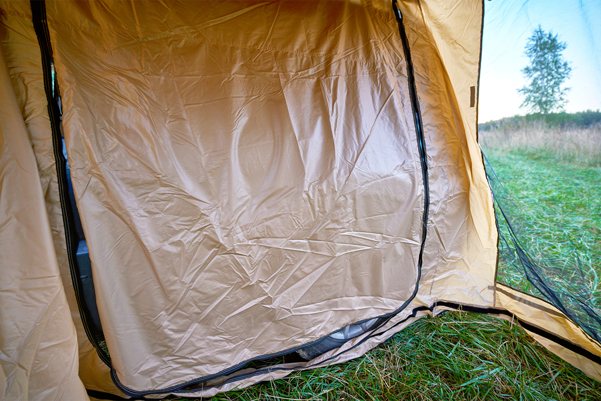Комплект стенок для веерного тента с окнами и дверью существенно повысит ваш уровень комфорта на природе. Стенки дают дополнительную защиту от ветра и дождя и позволяют организовать полноценный «тамбур» рядом с машиной. На отдыхе, во время многодневных стоянок подобная опция будет незаменимой при организации душевых процедур, как полноценная защита от ветра и посторонних взглядов. В жаркое время года, благодаря имеющимся окнам можно эффективно организовать проветривание, при этом наличие москитных сеток на окнах и двери не позволит насекомым донимать вас на отдыхе.