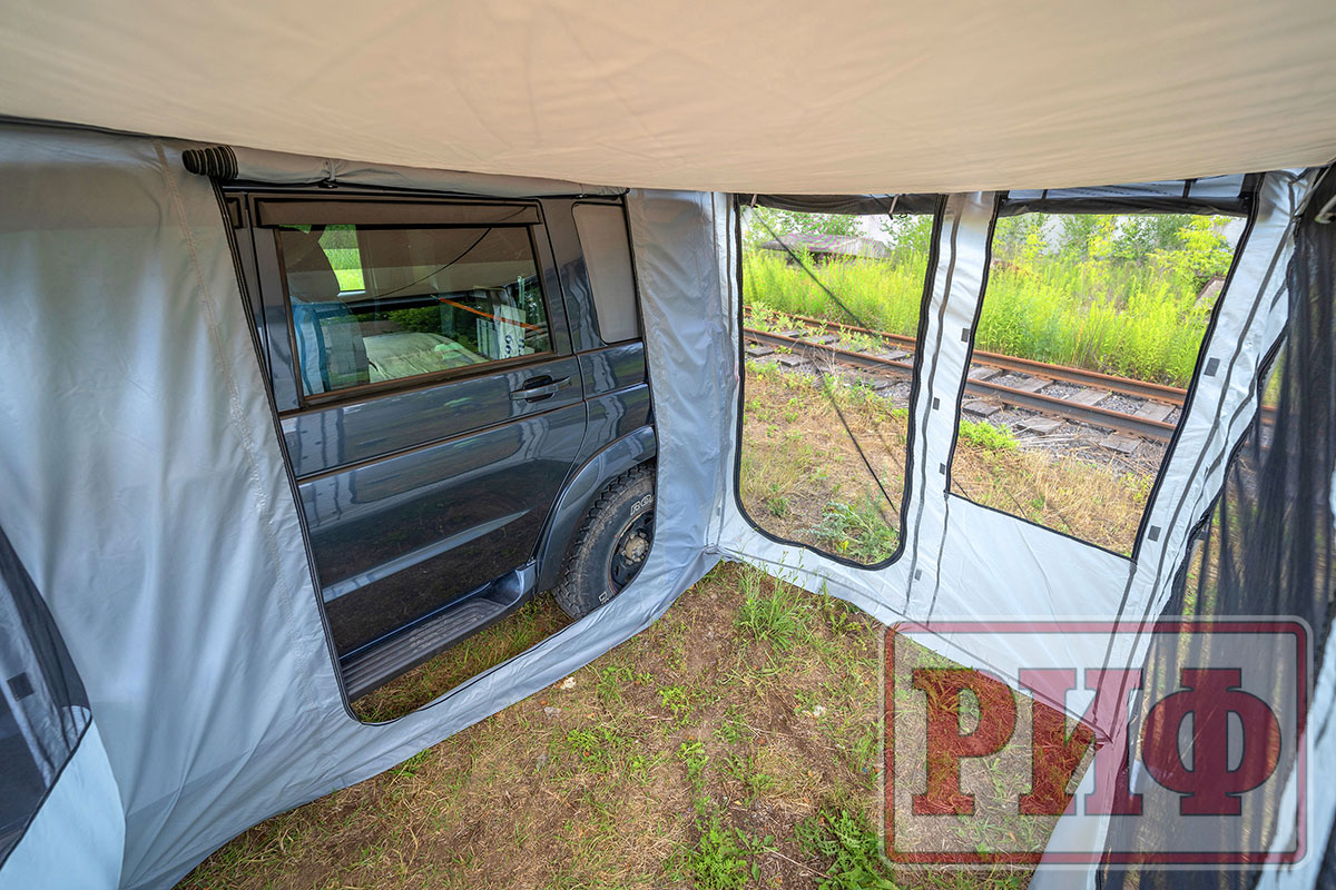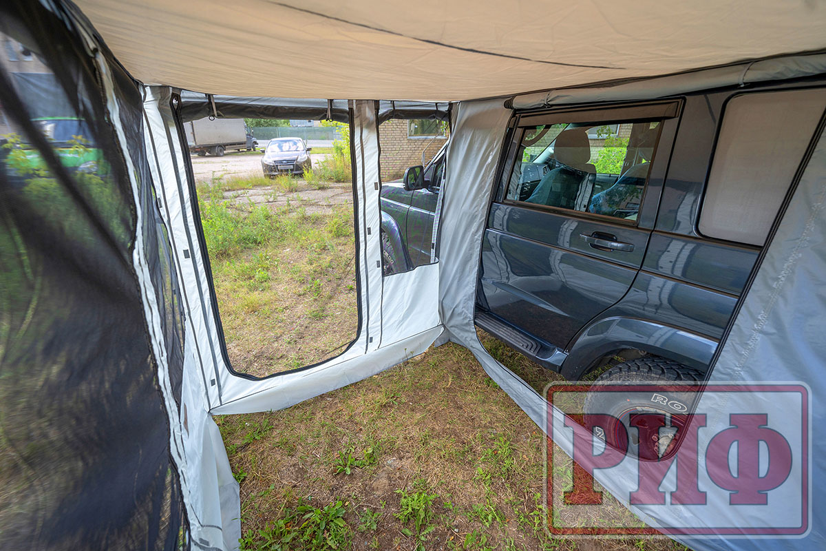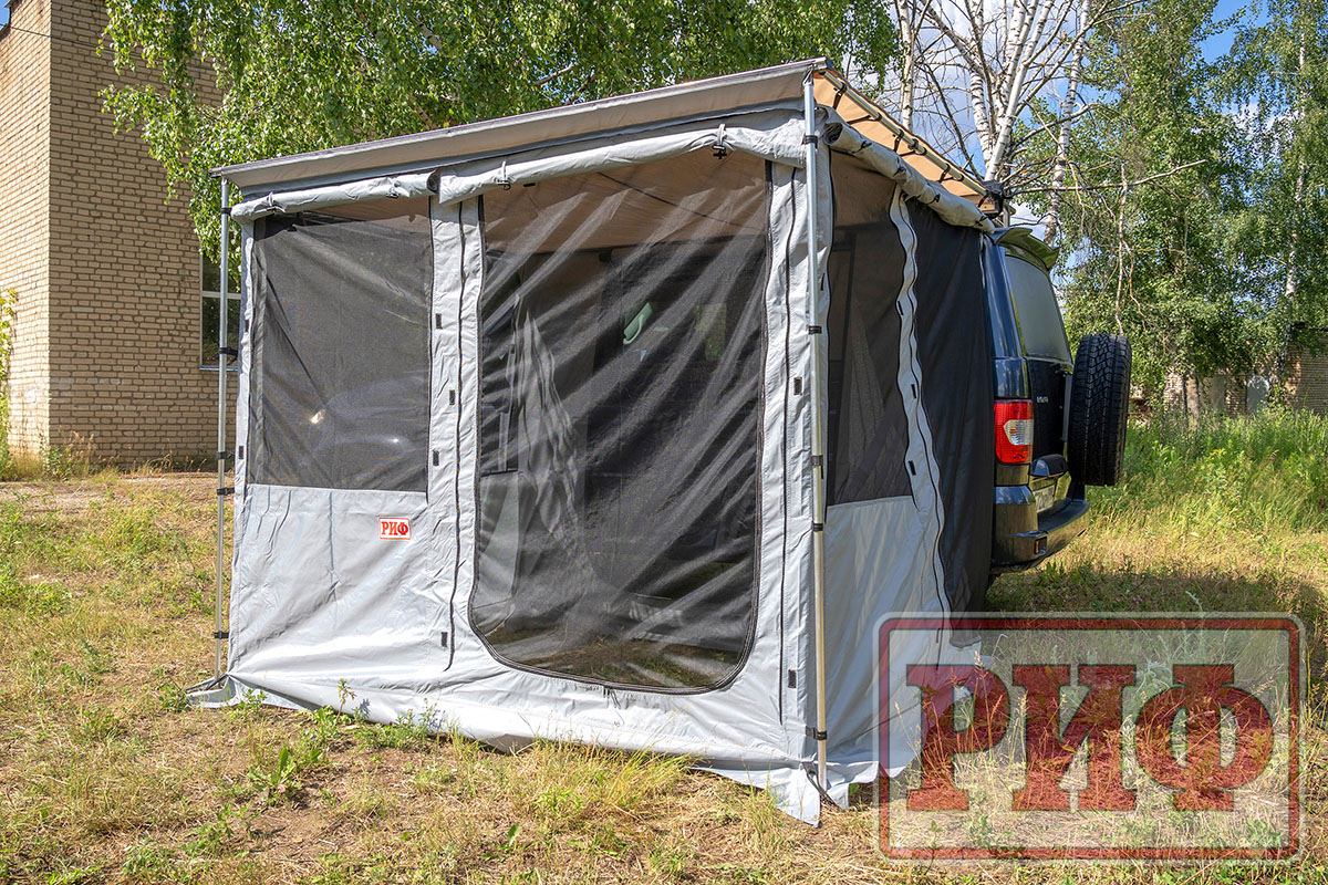 Комплект стенок для веерного тента с окнами и дверью существенно повысит ваш уровень комфорта на природе. Стенки дают дополнительную защиту от ветра и дождя и позволяют организовать полноценный «тамбур» рядом с машиной. На отдыхе, во время многодневных стоянок подобная опция будет незаменимой при организации душевых процедур, как полноценная защита от ветра и посторонних взглядов. В жаркое время года, благодаря имеющимся окнам можно эффективно организовать проветривание, при этом наличие москитных сеток на окнах и двери не позволит насекомым донимать вас на отдыхе.