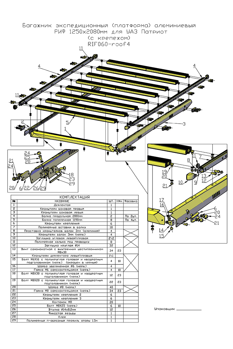 Багажник экспедиционный (платформа) алюминиевый РИФ 1250x2080 мм для УАЗ Патриот (с крепежом).