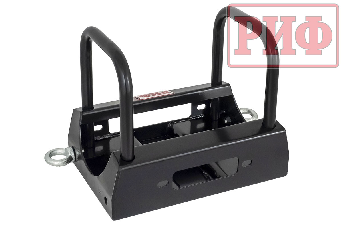 Лебедка устанавливается в компактную и практичную площадку РИФ с креплениями к буксирным проушинам, самым главным плюсом которой является простота ее использования. Благодаря такой площадке не потребуется никаких переделок, чтобы оснастить автомобиль лебедкой – вообще никаких изменений в конструкции авто. Все необходимое поселится в багажнике. Все, что нужно сделать на подготовительном этапе - это прицепить к клеммам аккумулятора и лебедки по паре длинных проводов с разъемом «папа-мама» и прикрутить лебедку и клюз/губы к площадке.