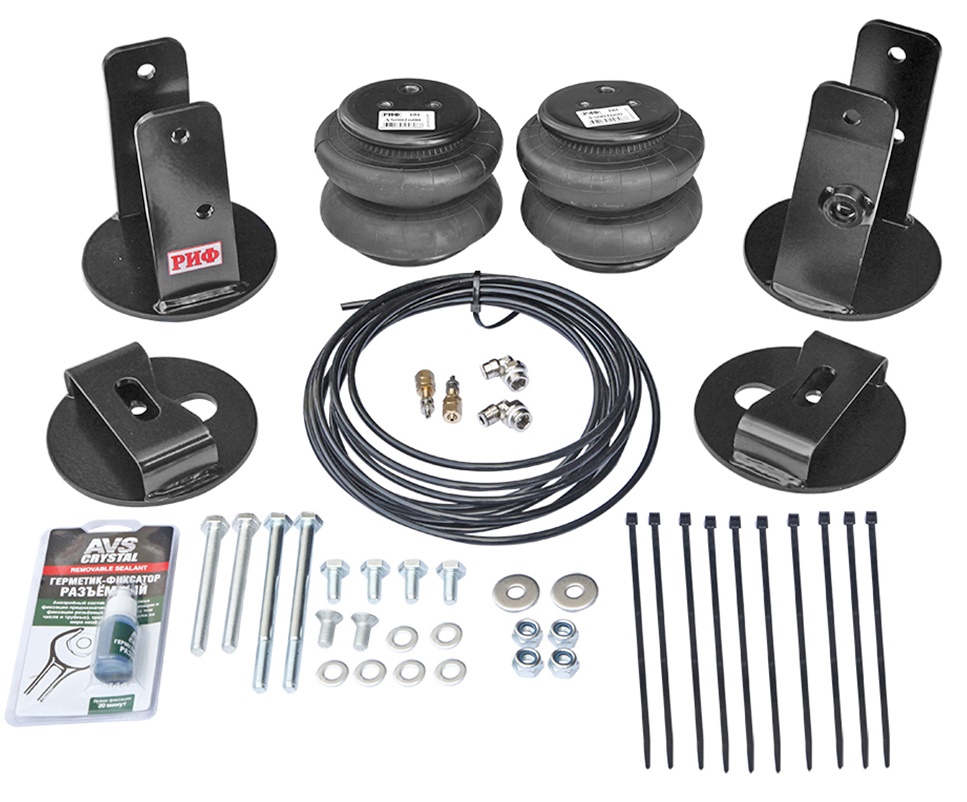 Комплект пневмоподвески РИФ устанавливается в дополнение к лифтованной подвеске автомобиля и позволяет снизить нагрузку на рессоры и использовать полную грузоподъёмность автомобиля без изменения геометрической проходимости.