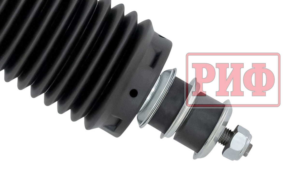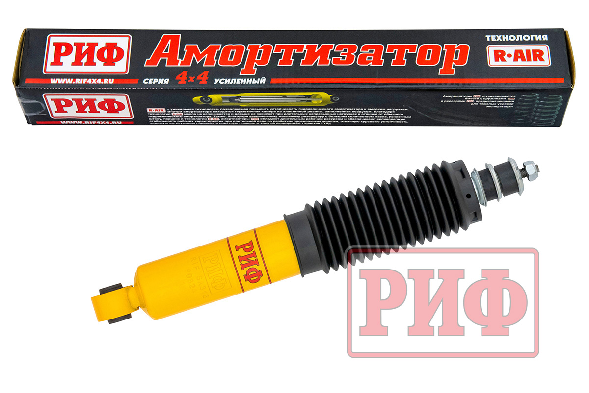 Усиленные амортизаторы РИФ изготовлены по уникальной технологии R-AIR, позволяющей повысить устойчивость гидравлического амортизатора к высоким нагрузкам. Внутри амортизатора находится герметичная камера из эластичной резины, заполненная воздухом. Благодаря технологии R-AIR масло не вспенивается и дольше не закипает при длительных непрерывных нагрузках в отличие от обычного гидравлического амортизатора или амортизатора с технологией Foam Cell, которую мы использовали ранее, где вспениванию препятствует просто прослойка из пористой резины.