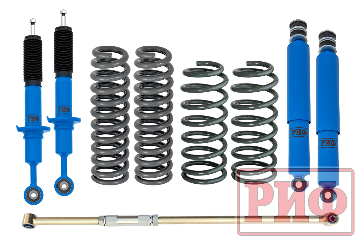 Все компоненты лифт-комплектов РИФ разработаны специально для эксплуатации внедорожника в тяжелых условиях на различных дорожных покрытиях. Амортизаторы с технологией R-AIR и пружины РИФ не только компенсируют вес установленного на внедорожнике дополнительного оборудования (бамперов, порогов, дополнительных топливных баков, лебедок и прочего), но также существенно повышают грузоподъемность автомобиля.