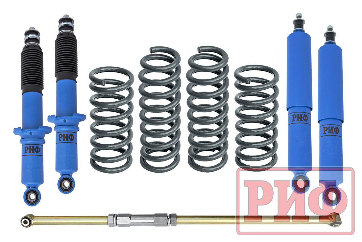 Все компоненты лифт-комплектов РИФ разработаны специально для эксплуатации внедорожника в тяжелых условиях на различных дорожных покрытиях. Амортизаторы с технологией R-AIR и пружины РИФ не только компенсируют вес установленного на внедорожнике дополнительного оборудования (бамперов, порогов, дополнительных топливных баков, лебедок и прочего), но также существенно повышают грузоподъемность автомобиля.