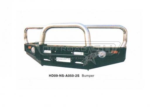 Силовой бампер PowerFul для внедорожника Nissan Patrol Y60 N601-2S. Комплектуется встроенной площадкой под лебедку, большой хромированной дугой, противотуманными фарами, поворотниками и комплектом крепления к раме автомобиля. Толщина бампера 3мм, элементы крепления 3-4 мм.