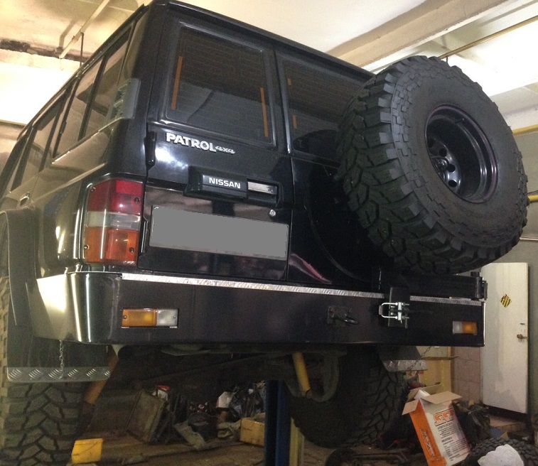 Силовой бампер PowerFul задний для внедорожника Nissan Patrol Y60 N602-A. Комплектуется одной калиткой под запасное колесо, поворотниками и комплектом крепления к раме автомобиля. Толщина бампера 3мм, элементы крепления 3-4 мм, калитка на подшипнике.