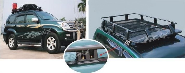 Багажник устанавливается взамен штатных рейлингов. Оригинальные места Toyota Land Cruiser Prado 120. Багажник изготовлен из стали, окрас порошковый, размер корзины 1970х1170х19, креплений 6 штук. На багажнике имеется металическая сетка, для легкого перемещения по багажнику, есть места для установки дополнительного света.