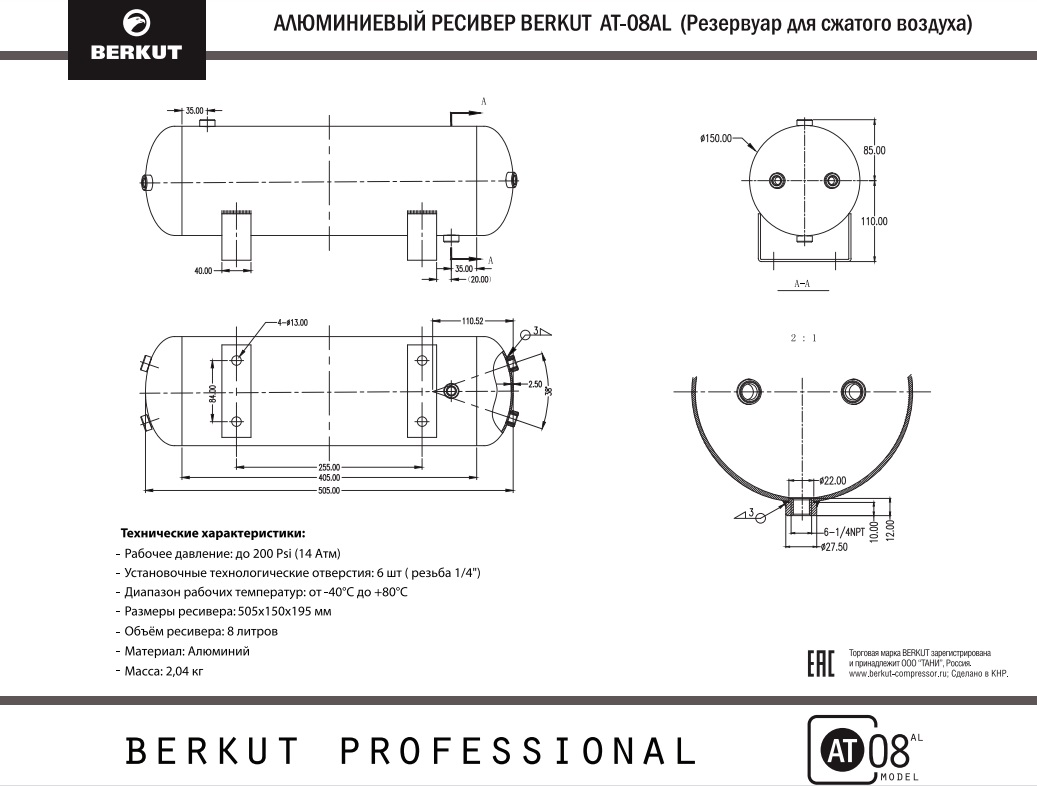 Ресиверы служат для накопления и хранения сжатого воздуха, а также для выравнивания давления в пневмосистеме. Ресивер BERKUT АТ-08AL — это компактный резервуар для сжатого воздуха, рассчитанный под рабочее давление до 200 PSI (14 Атм). Баллон выполнен из алюминия и оснащен шестью установочными технологическими отверстиями.