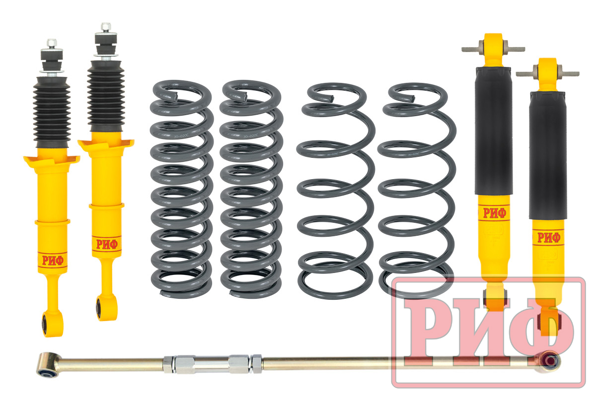 Все компоненты лифт-комплектов РИФ разработаны специально для эксплуатации внедорожника в тяжелых условиях на различных дорожных покрытиях. Амортизаторы с технологией R-AIR и пружины РИФ не только компенсируют вес установленного на внедорожнике дополнительного оборудования (бамперов, порогов, дополнительных топливных баков, лебедок и прочего), но также существенно повышают грузоподъемность автомобиля.