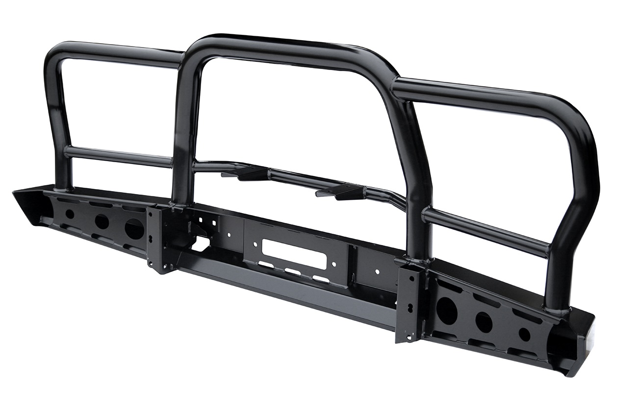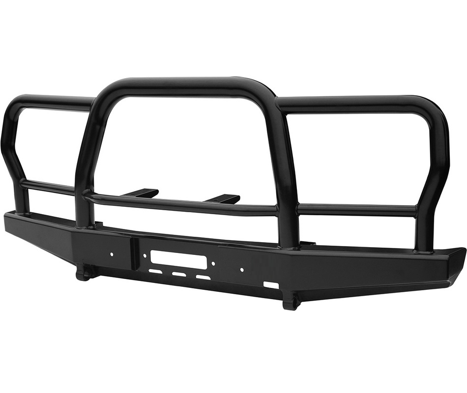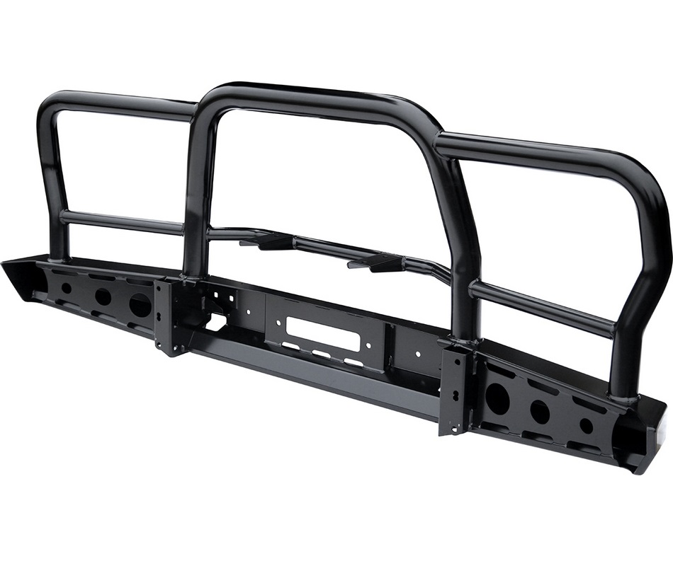 Передний силовой бампер с защитной дугой служит для защиты автомобиля на бездорожье и в городе. В случае контакта или легкого столкновения с препятствием в виде камней, бревен, пней, колей или незадачливых водителей, риск получить серьезные повреждения машины существенно уменьшается, а это очень важно в экспедициях и в повседневной жизни. Бампер с кенгурятником не только защитит, но и украсит внедорожник благодаря эффектному и элегантному дизайну.