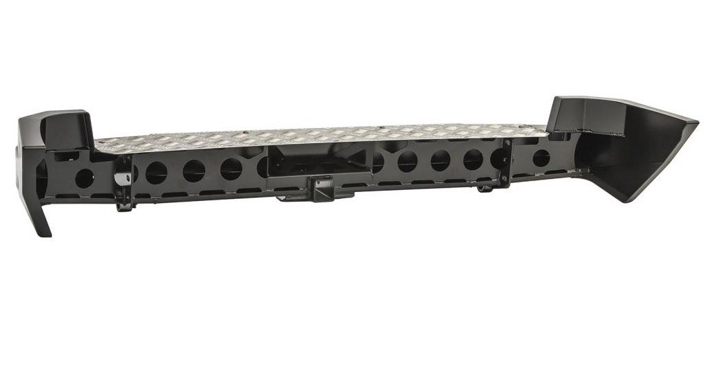 В нижней части бампера располагается интегрированный в корпус «квадрат» стандарта 2”, который может использоваться для крепления фаркопа, площадки-ступеньки, буксировочной проушины, площадки под переносную лебедку и пр. Предусмотрены две мощные буксировочные проушины и вырезы для размещения дублирующих сигнальных фонарей (основные могут перекрываться запасными колесами большого диаметра).