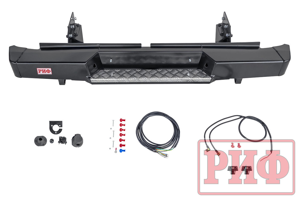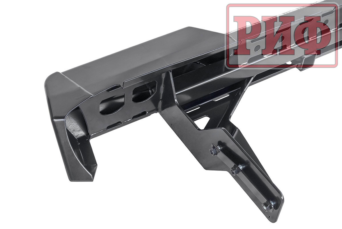 Задний силовой бампер РИФ надежно защитит кузов автомобиля на бездорожье или в городе в случае непредвиденных инцидентов. Бампер оборудован упорами под хай джек и буксирными проушинами для работы с рывковой или буксировочной стропой.