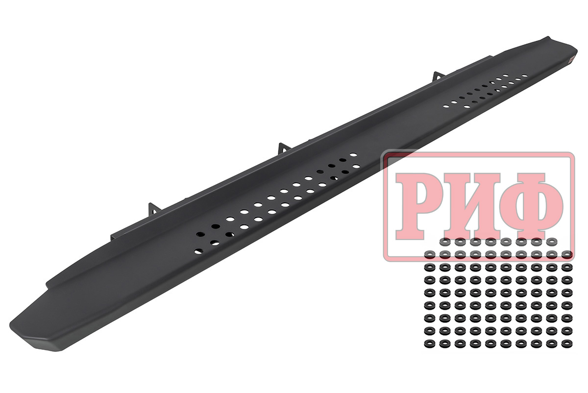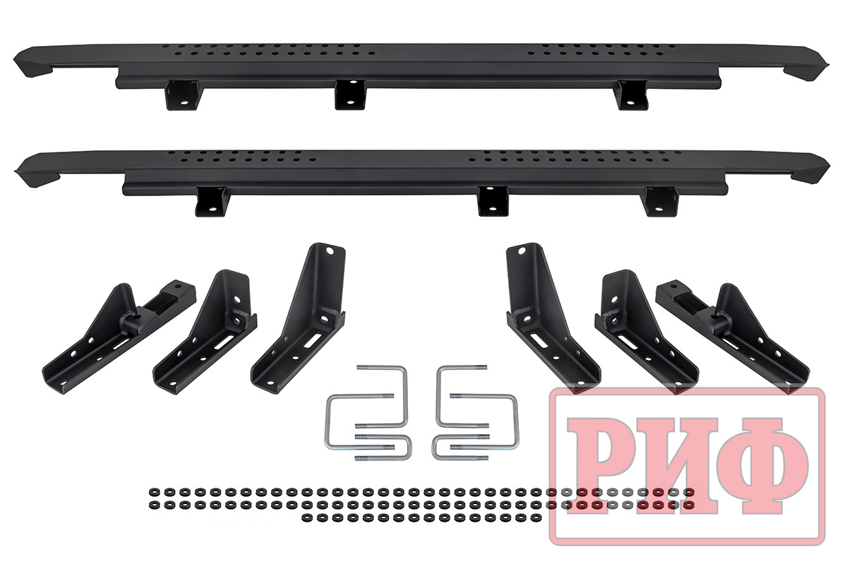 Забраться в салон благодаря порогам РИФ легко и просто. Конструкция порогов РИФ крайне прочна и долговечна, пороги рассчитаны на эксплуатацию в тяжелых условиях. Пороги крепятся к раме с помощью стремянок.