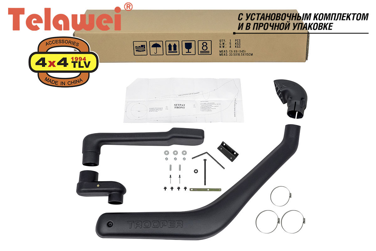 Шноркель Telawei , китайский шноркель - это труба-воздухозаборник необходимая для форсирования водных преград и предназначенная для защиты двигателя от попадания воды и предохраняющая его от гидроудара. Также китайский шноркель уменьшает загрязнение воздушного фильтра при езде по песку и пыльным дорогам. Шноркель Telawei, китайский шноркель - обязательный атрибут Вашего внедорожника. Китайский шноркель Telawei не уступает по качеству изготовления таким брендам как Safari Snorkel, TJM Snorkel котор