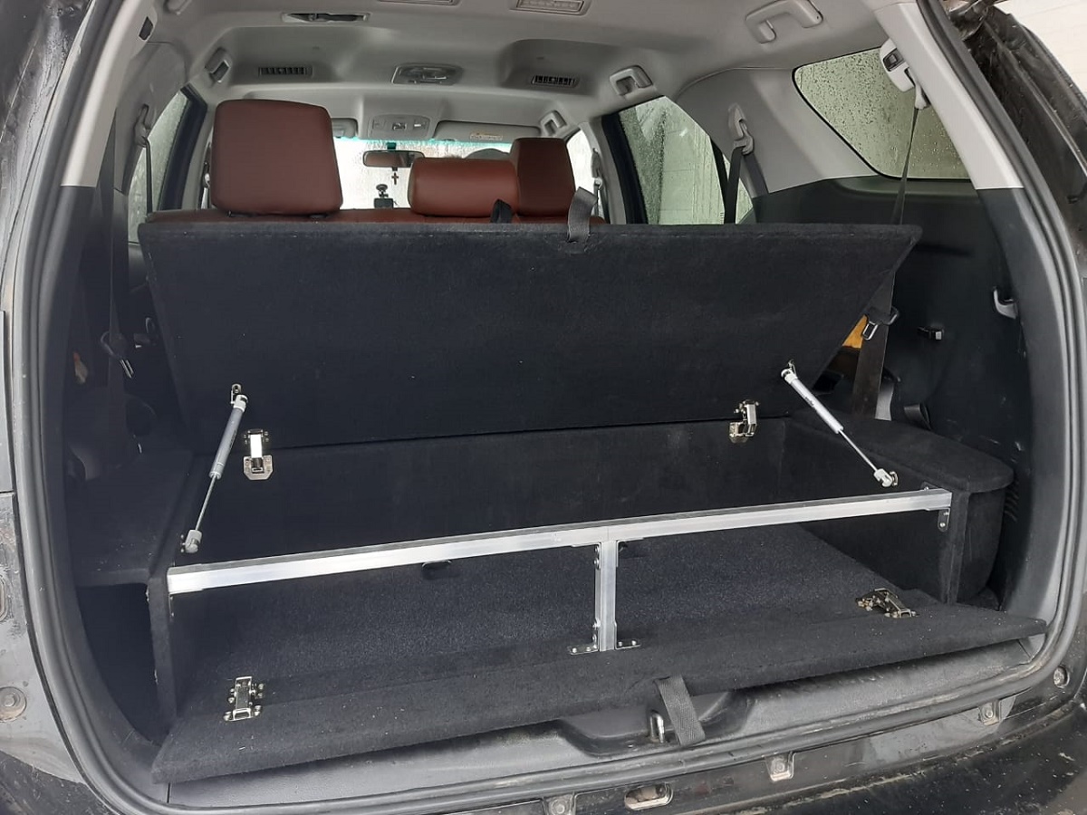 Данный органайзер-спальник позволяет убрать весь шмурдяк (стропы, огнетушитель, аптечку, небольшие домкраты и т.д.) в свои просторные ящики. А так же при сложенных спинках сидений образует ровный пол, а значит можно с комфортом обустроить спальное место на несколько человек.