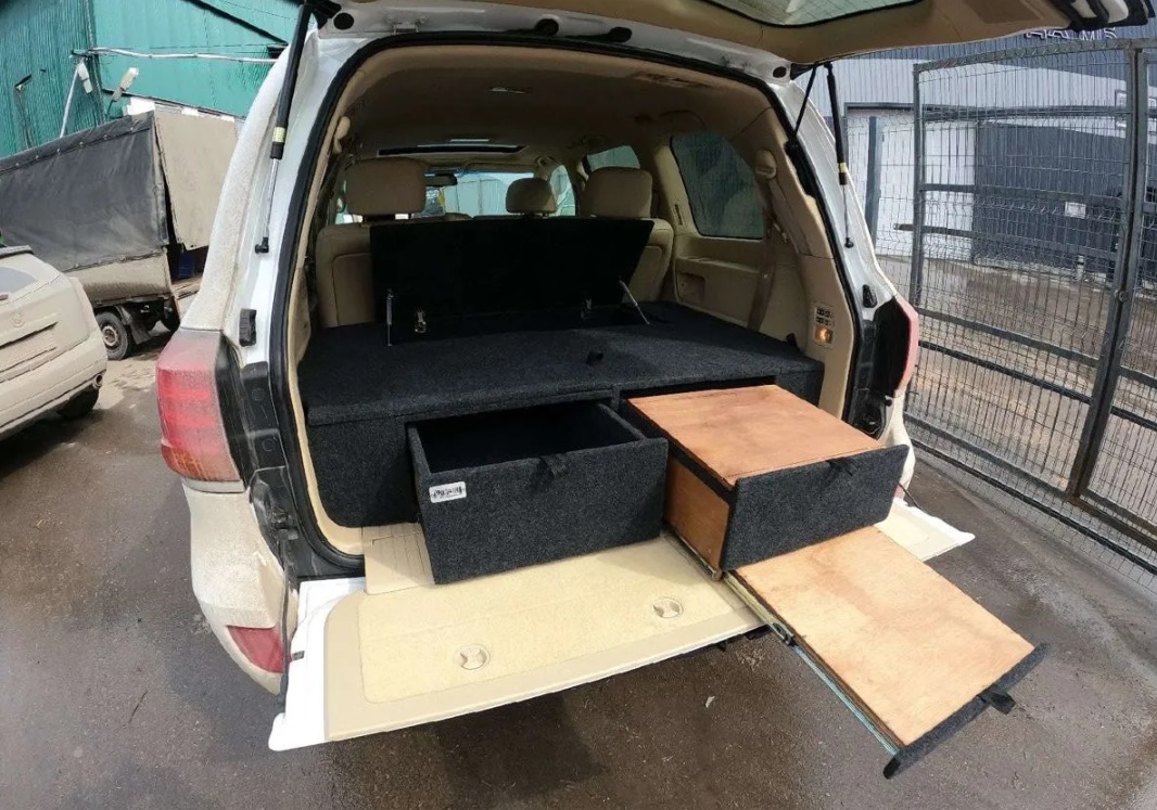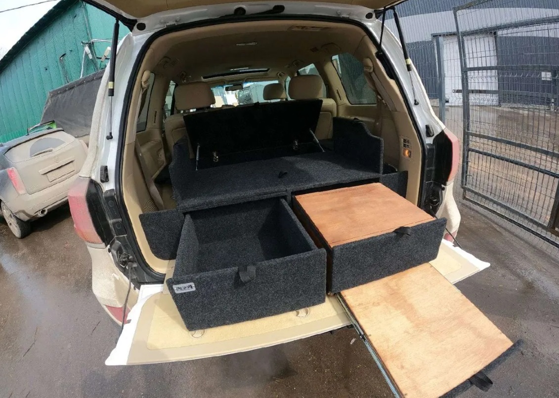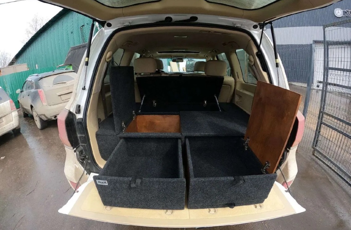 Органайзер (спальник) с вместительными отсеками. Имеет два выдвижных ящика в половину глубины багажника. Сзади большой отсек с крышкой вверх, а так же имеются отсеки по бокам! Данная модель имеет легкий вес в 45кг и большую нагрузку на органайзер до 500 кг!