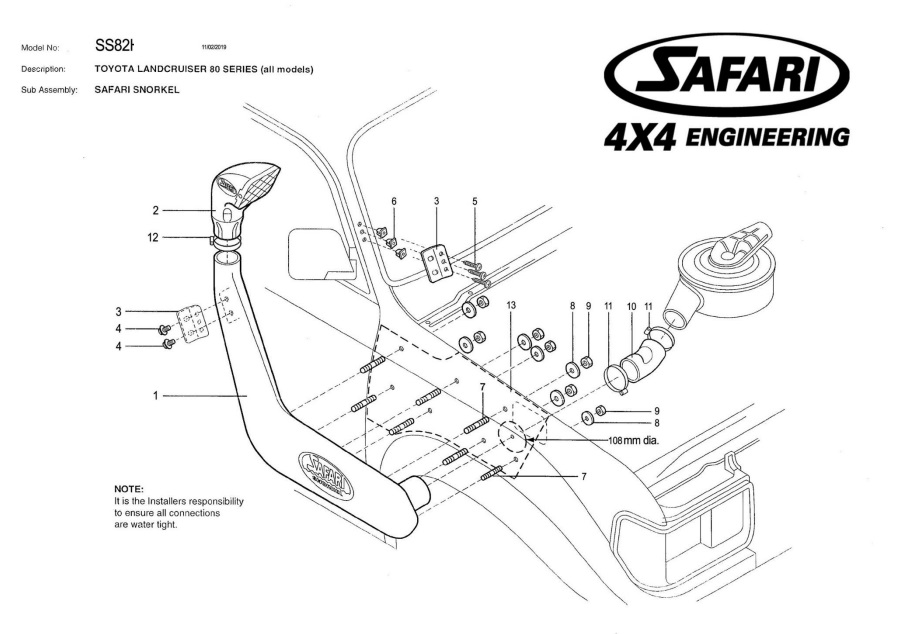 Шноркель Safari SS82R предназначен для установки на автомобиль Toyota Landcruiser 80 series / Lexus LX 450, с дизельным двигателем 4.2Litre и бензиновым двигателем 4. 0Litre, 4.5Litre. Шноркель Safari SS82R устанавливается на правое крыло автомобиля.