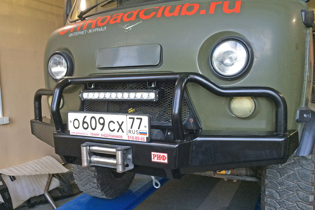 Бампер РИФ силовой передний УАЗ Буханка усиленный, c площ. под лебёдку, с низкой защитной дугой, лифт 65 мм.