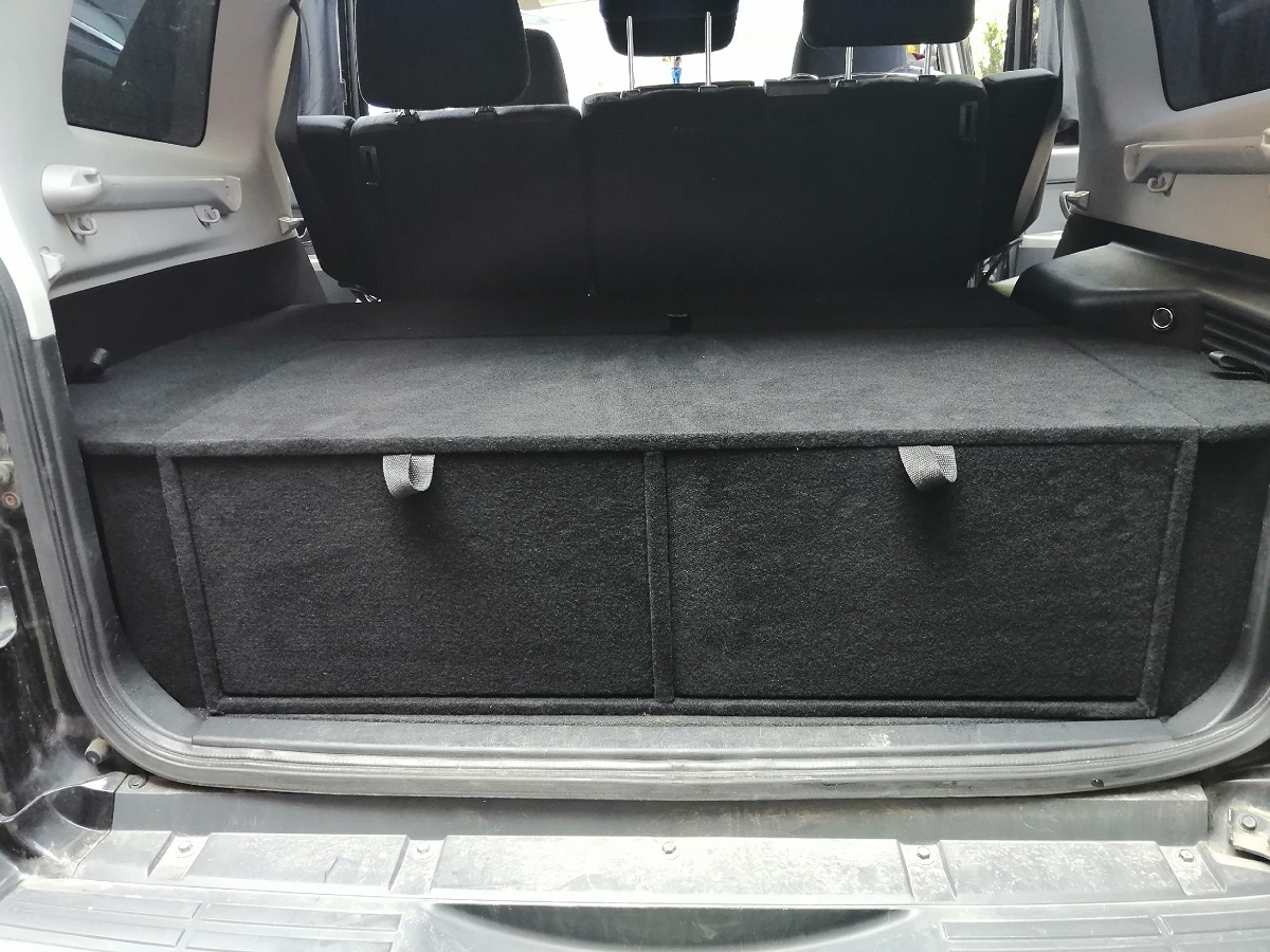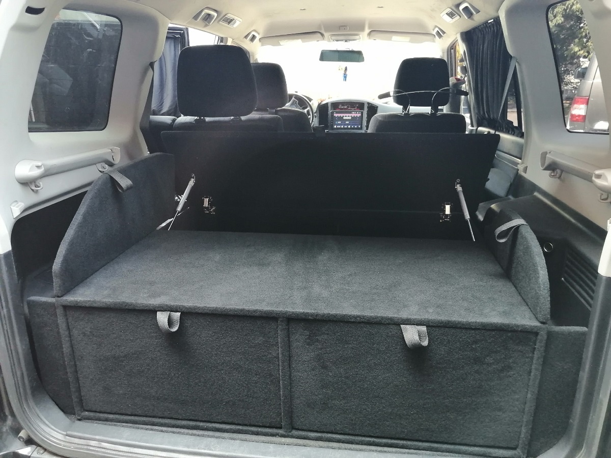 Данный органайзер-спальник позволяет убрать весь шмурдяк (стропы, огнетушитель, аптечку, небольшие домкраты и т.д.) в свои просторные ящики. А так же при сложенных спинках сидений образует ровный пол, а значит можно с комфортом обустроить спальное место на несколько человек.